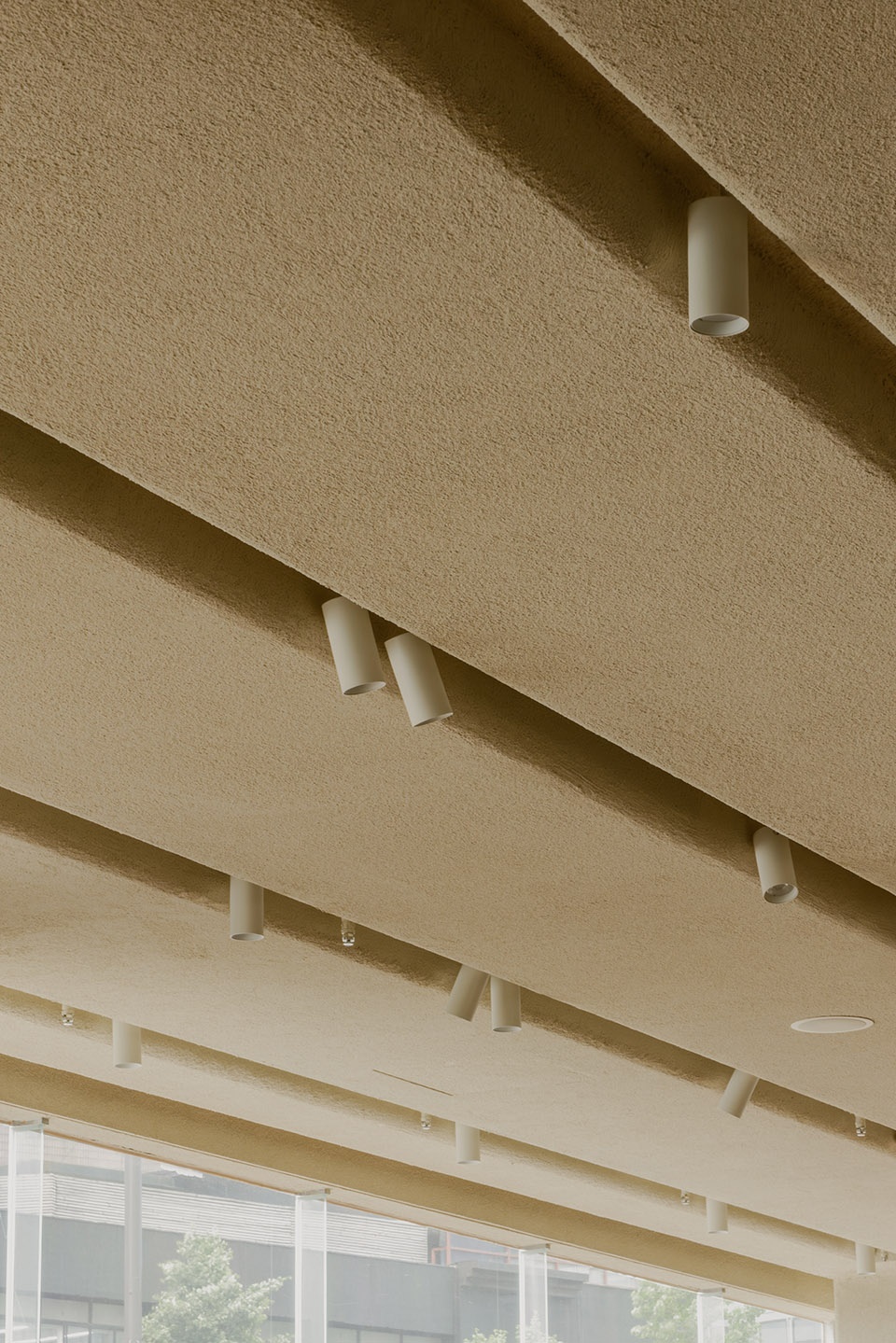 一层天花采用金属网材质,不仅增强了空间的通透感,还巧妙地遮挡了天花内复杂的设备,使整体视觉更为整洁而不显压抑。在金属网板的间隙间,我们嵌入了轨道系统,并在轨道上设置照明和消防喷淋装置,这不仅使天花结构更显简洁有序,也确保了照明系统能够灵活适应不同的空间布局。我们希望通过这一设计,在粗犷与精致之间找到恰到好处的平衡。