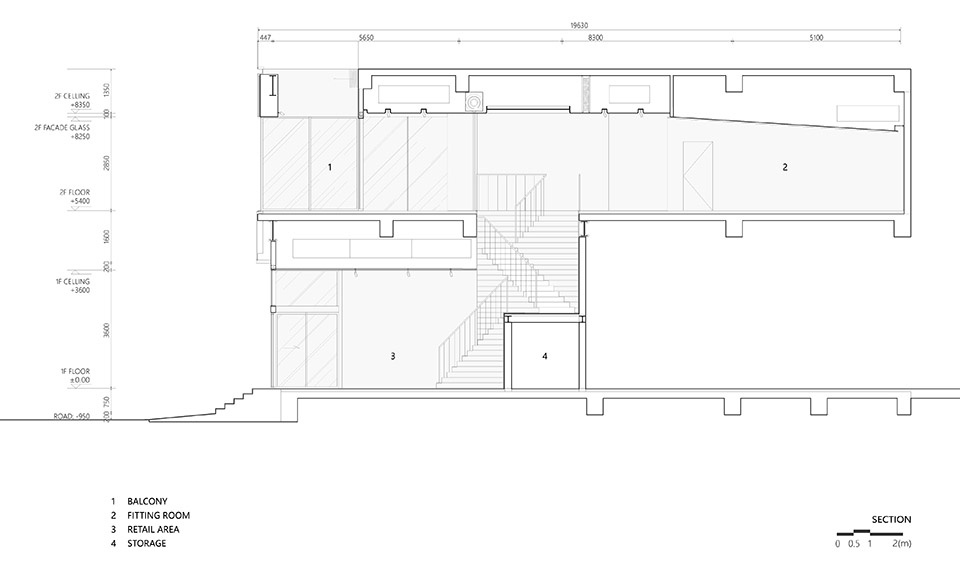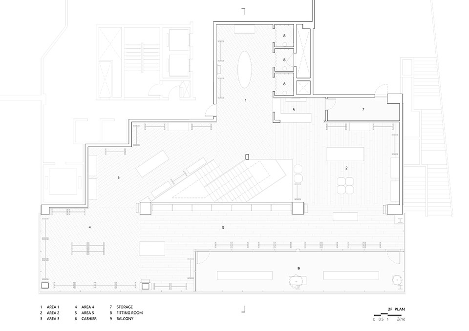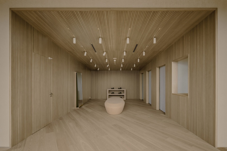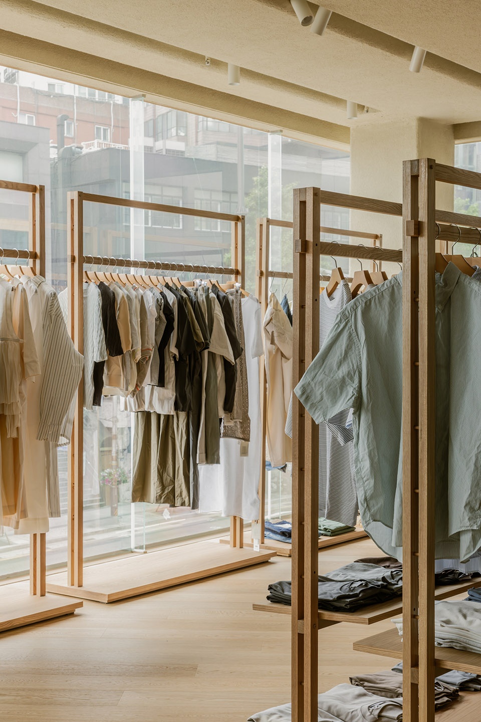 The second floor is structured around five functional zones arranged around a central void. We applied three types of wood flooring—each with distinct textures and grain orientations—to enrich the spatial experience. As visitors move through the space, we hope they will not only encounter carefully curated clothing, but also perceive the subtle shifts in atmosphere between different areas.