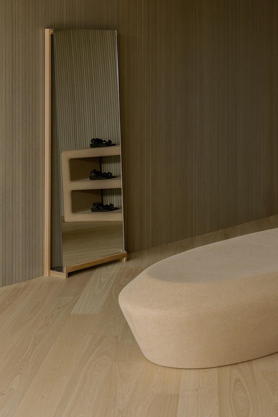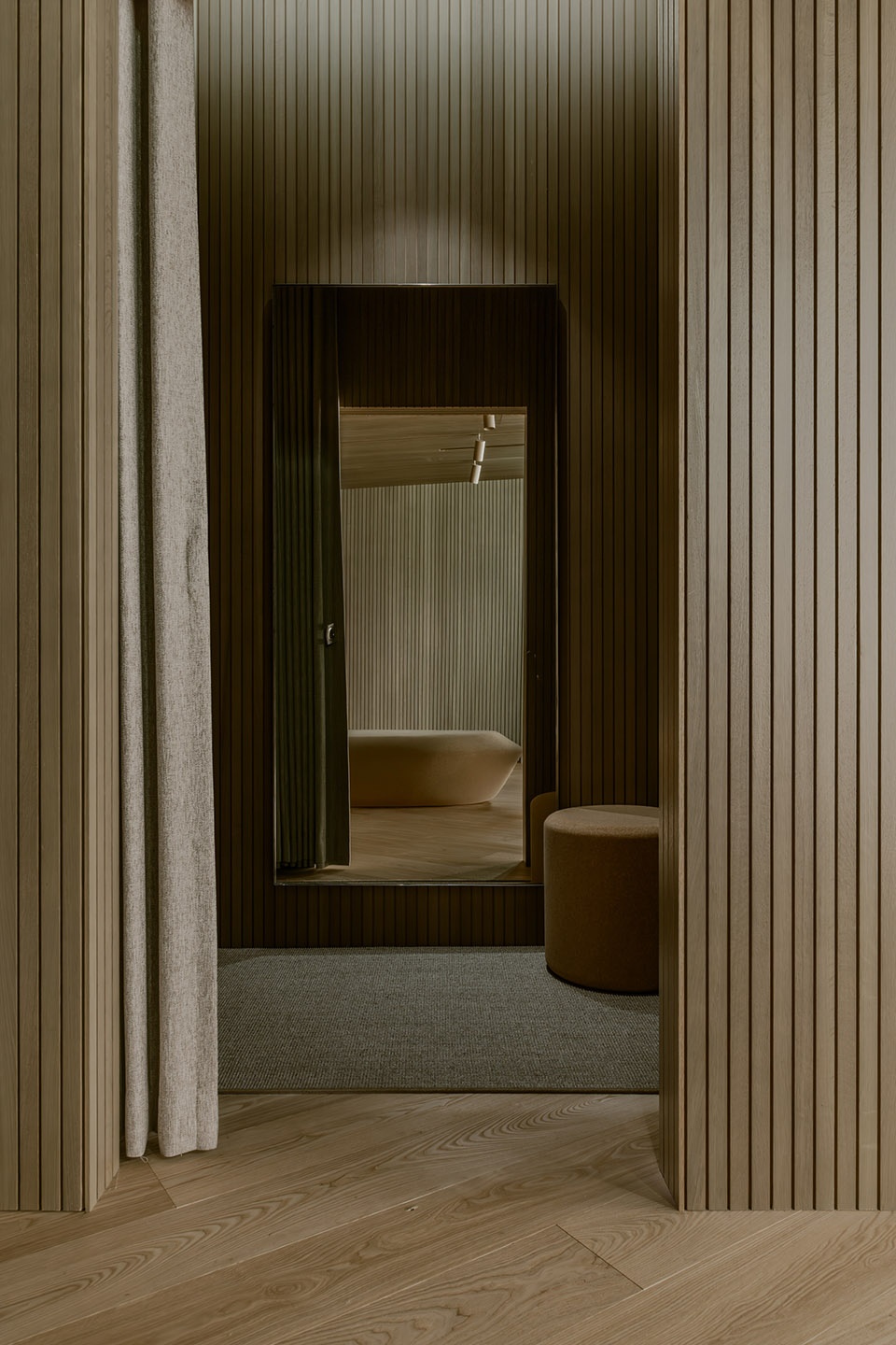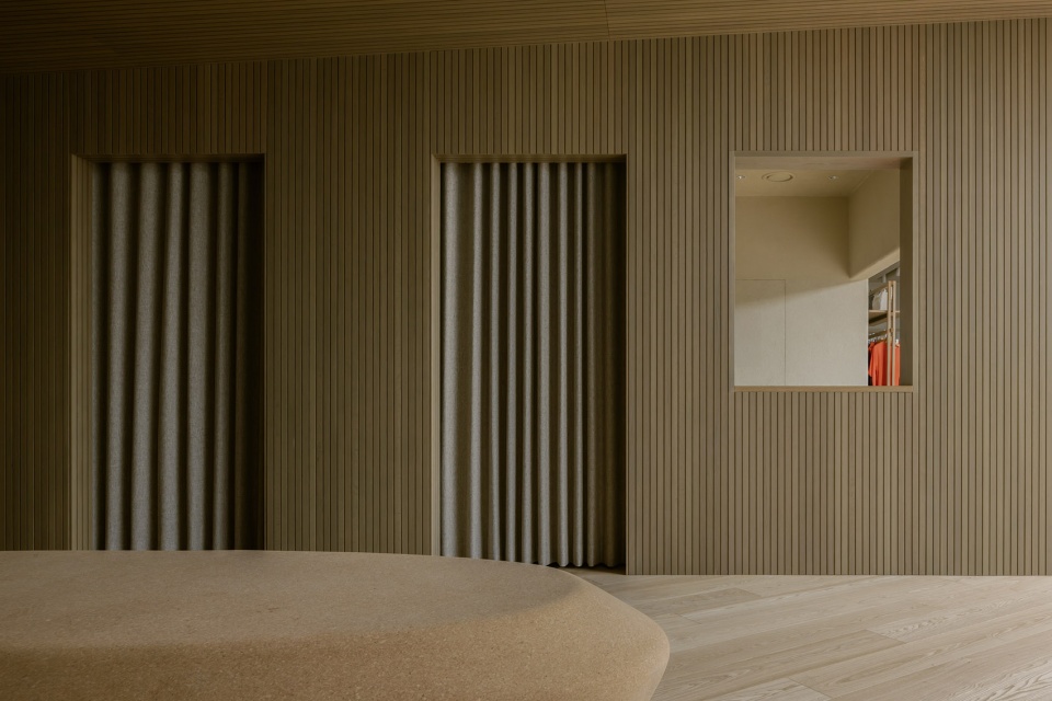 在二层的内侧布置休息区与试衣空间。采用 30mm宽的实木条进行围合,营造出既独立又开放的氛围。实木的天然质感与温色调,为空间注入一份自然与舒适,让客人在试衣和休息时能够被木材的天然纹理与质感所包裹。
