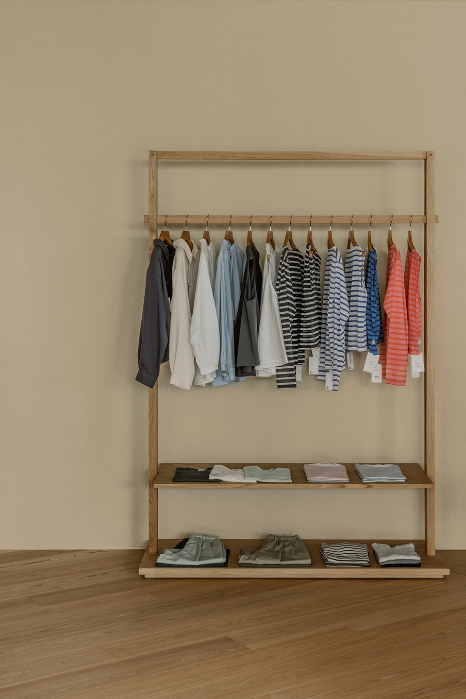 服装挂杆设计旨在实现灵活调节,通过在两根竖向木条之间嵌入横杆或层板,不仅满足了不同陈列需求,也为展示增添了层次感和变化性。