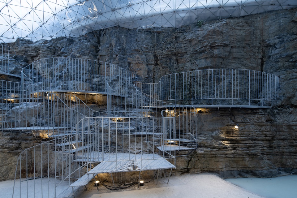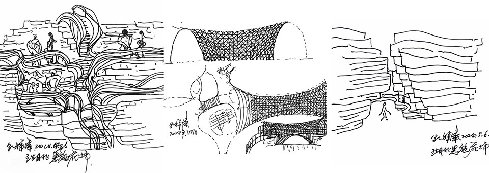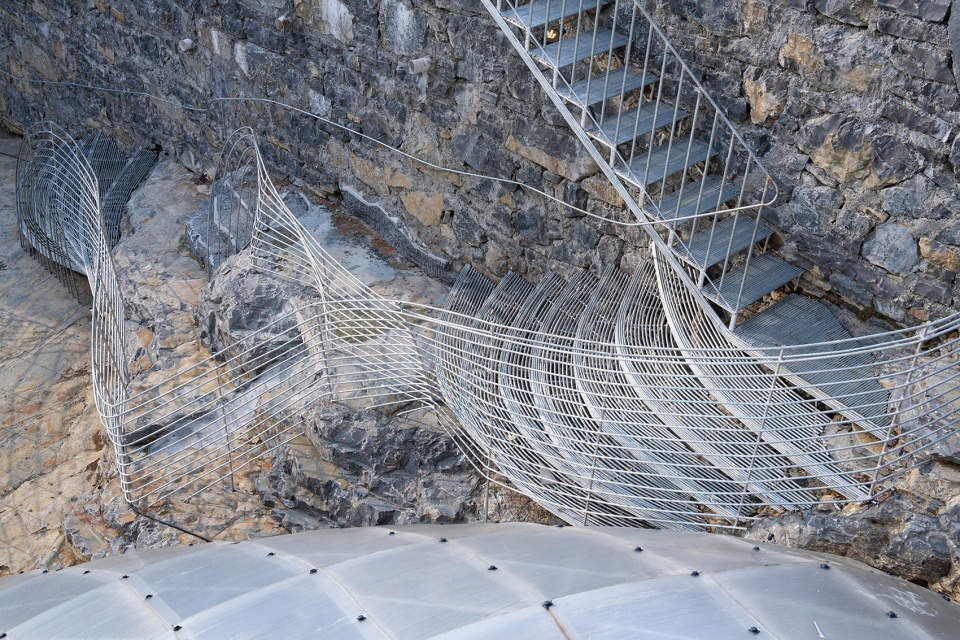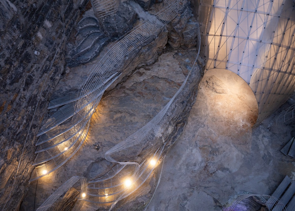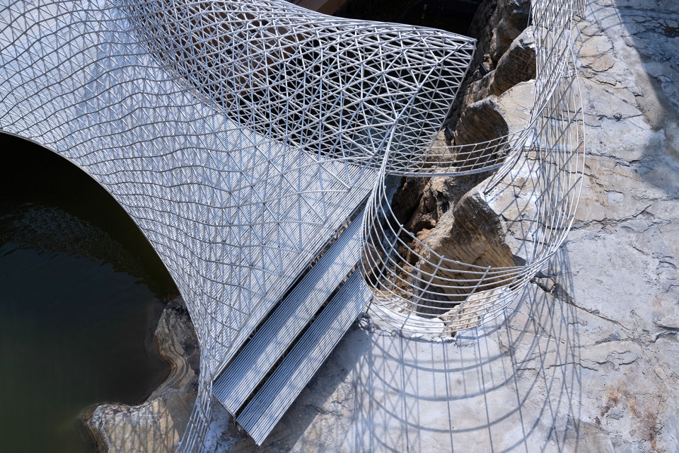 Given complex on-site terrain and spatial texture, the project adopts on-site design. The studio, with rural construction experience, collaborates with local craftsmen and uses mature reinforced steel weaving/welding techniques. It aims to highlight the cliff rocks’ beauty with low-intervention design, control costs, and create the spatial image of “reinforced steel dancing on rocks” via slender steel combinations.