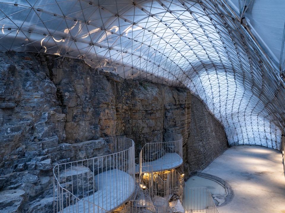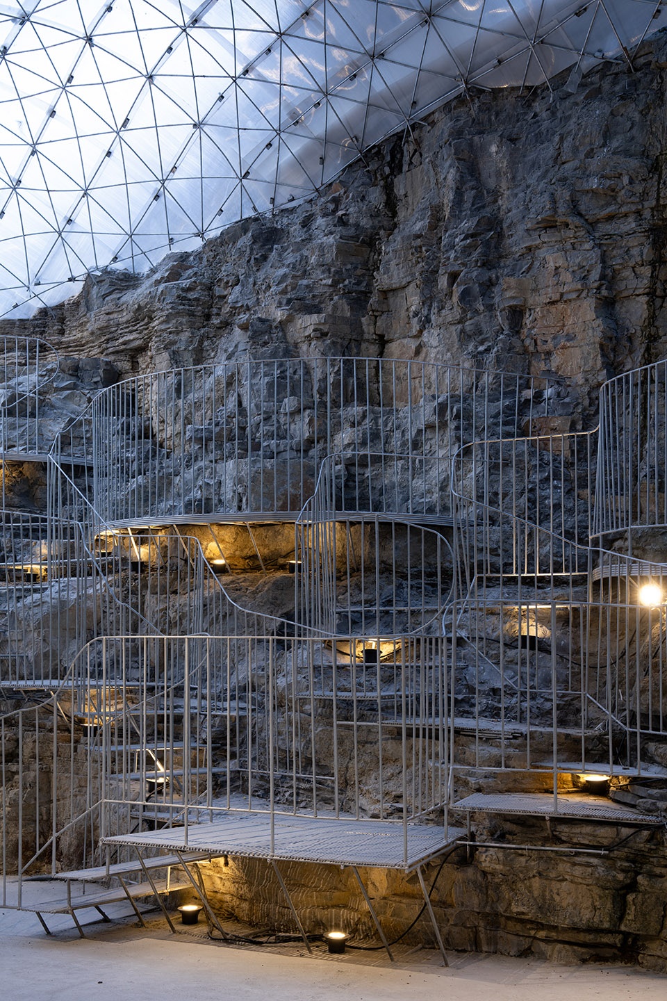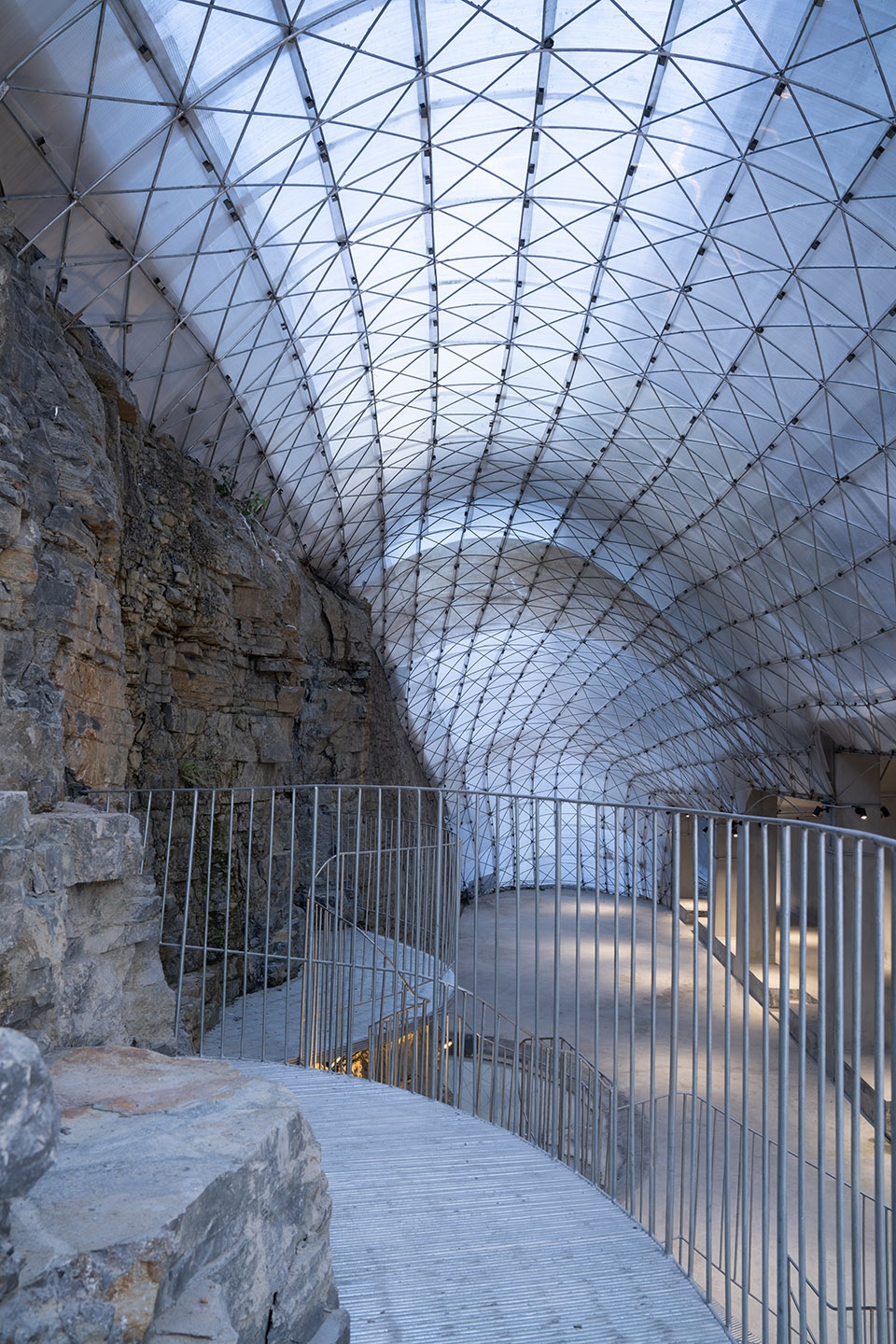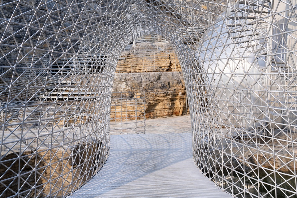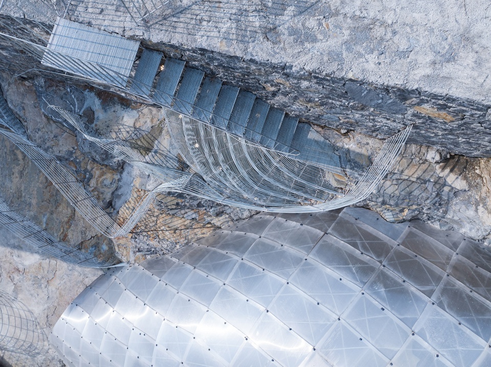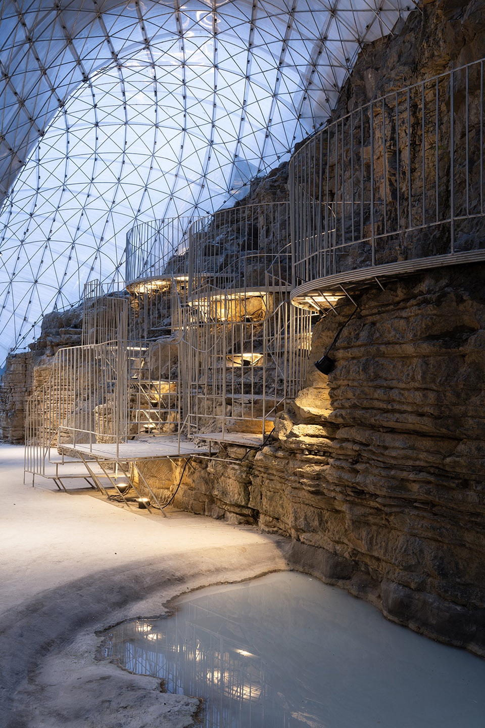 The design follows “skillful borrowing” for low-cost construction: “borrow shape” (use cliff height difference and carved rock as seats to save costs); “borrow structure” (reuse the elevated floor’s beams/columns); “borrow space” (cover the gray space to improve land use). The dome uses steel weaving to disperse load; the cliff seats and boardwalk are cantilevered, fixed by steel anchors. Honeycomb polycarbonate panels filter light and suit Enshi’s cool summers.