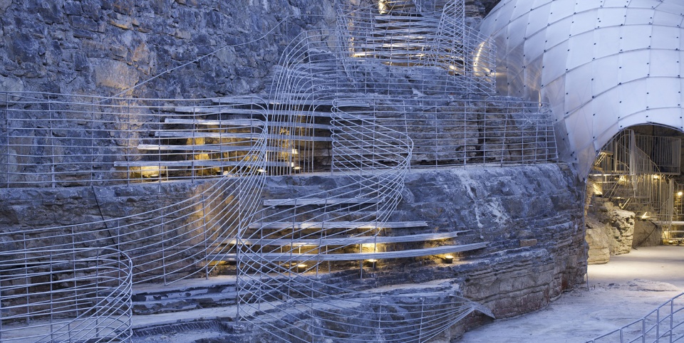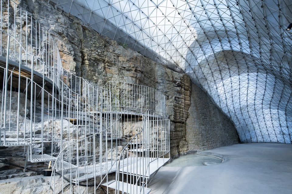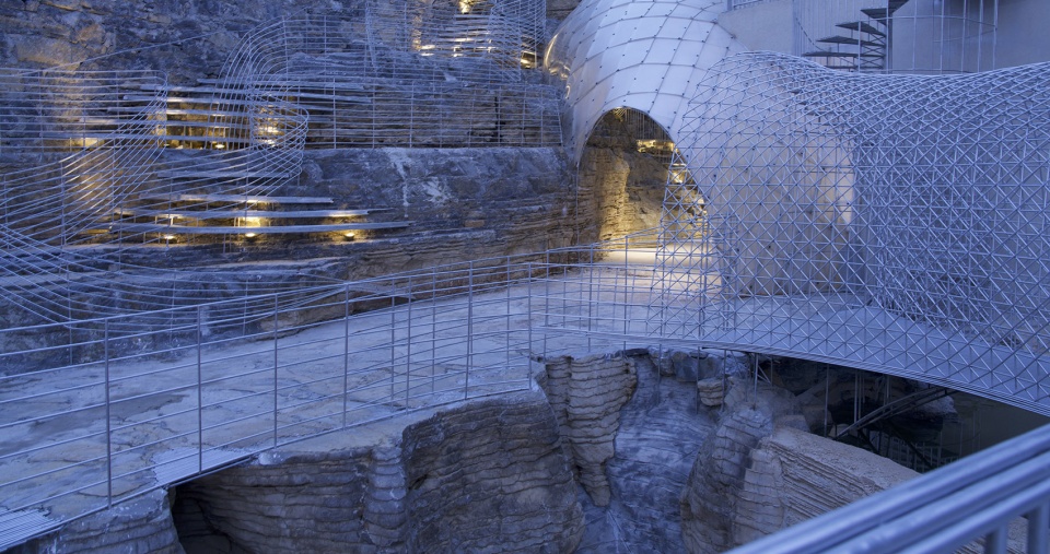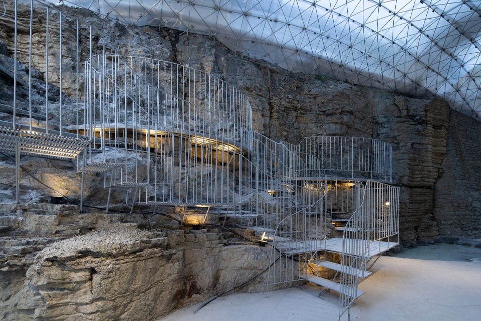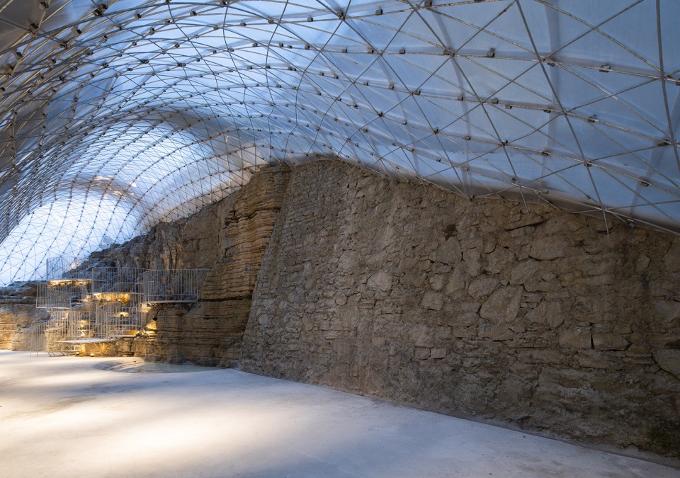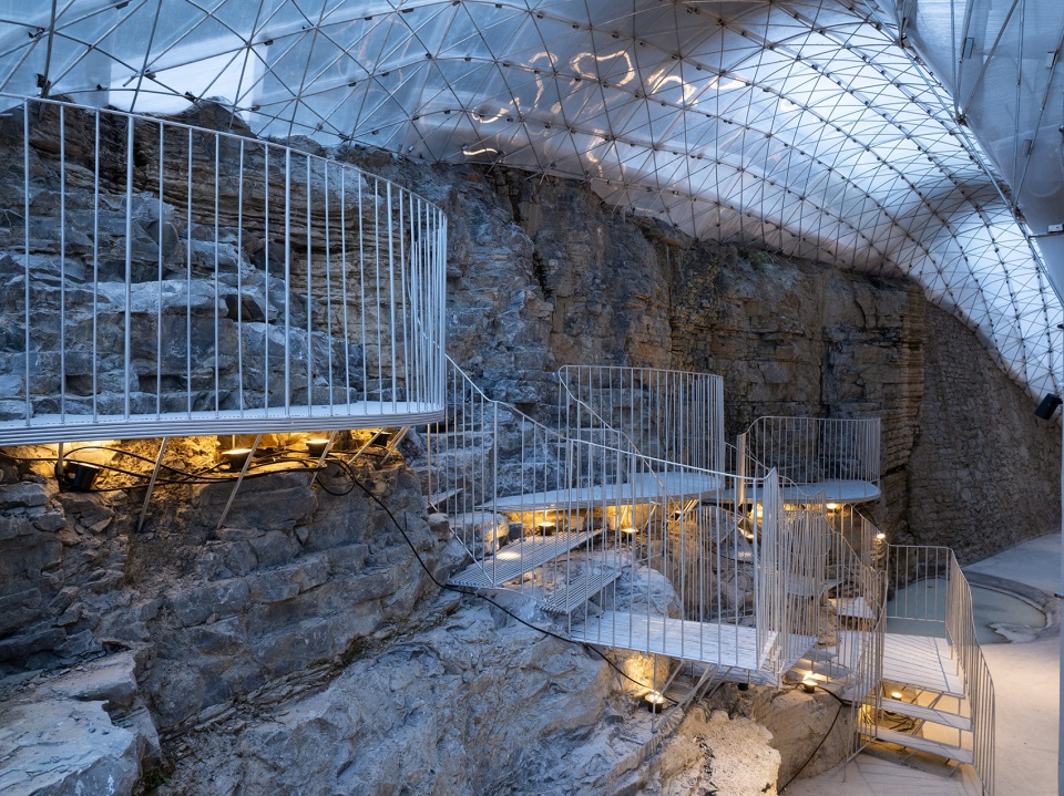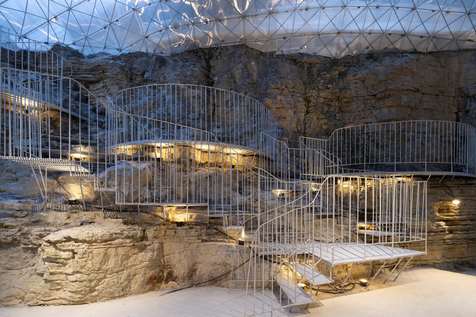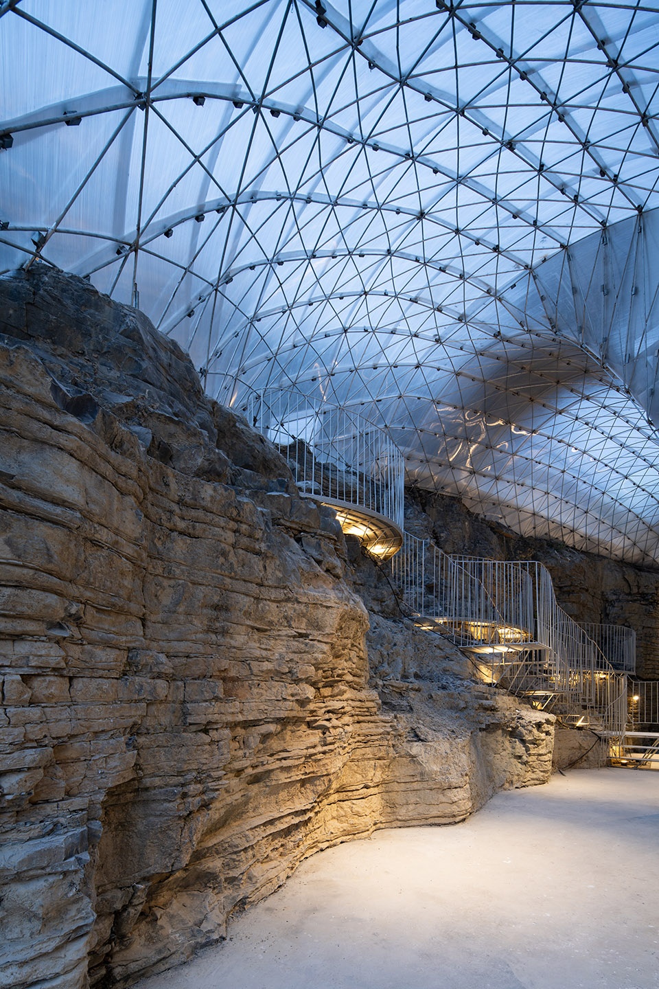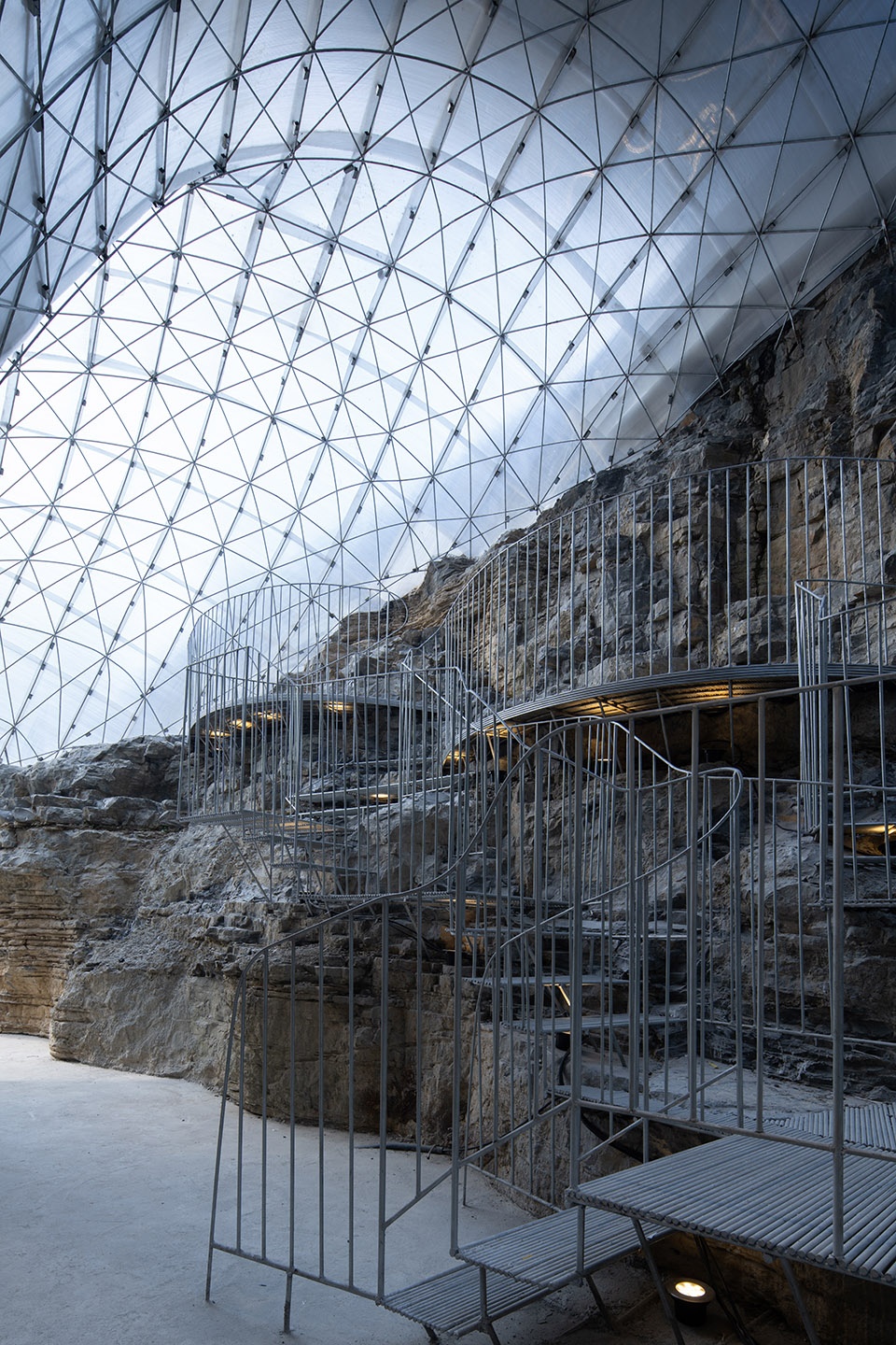 The design follows “skillful borrowing” for low-cost construction: “borrow shape” (use cliff height difference and carved rock as seats to save costs); “borrow structure” (reuse the elevated floor’s beams/columns); “borrow space” (cover the gray space to improve land use). The dome uses steel weaving to disperse load; the cliff seats and boardwalk are cantilevered, fixed by steel anchors. Honeycomb polycarbonate panels filter light and suit Enshi’s cool summers.