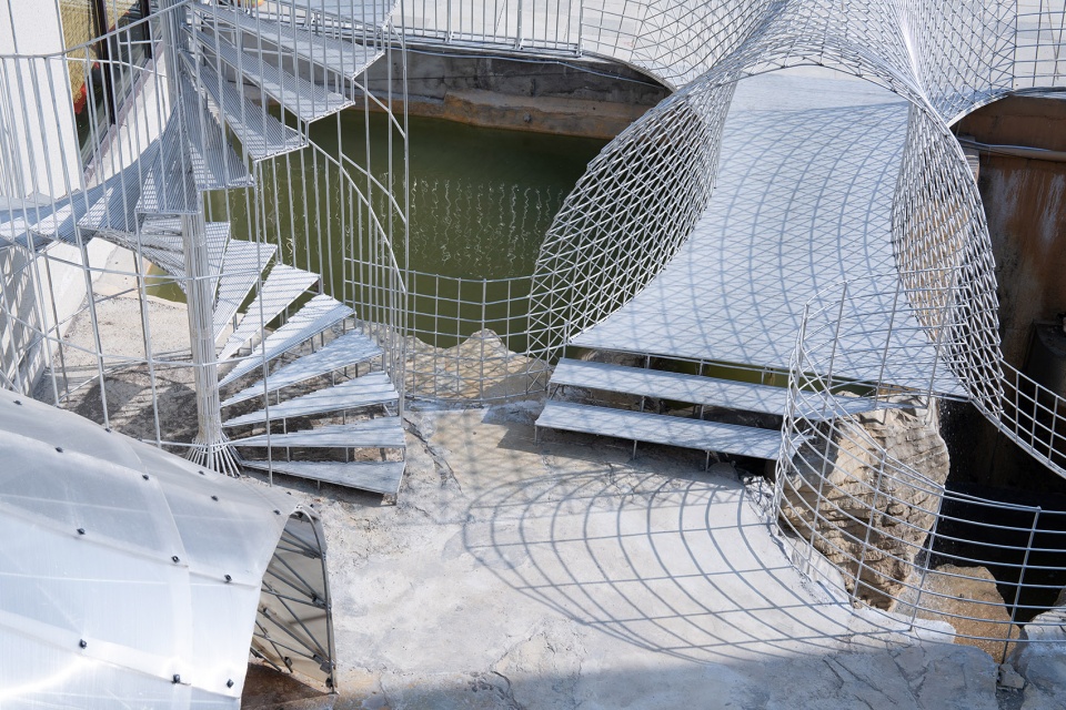 鉴于现场地形及空间肌理复杂,项目要求采用在地设计与营造模式。工作室延续既有乡建营造经验,通过与当地工匠深度协作,以在地化创作响应空间需求。项目继续沿用工作室成熟的钢筋编织与焊接工艺,旨在以低介入度设计凸显崖体岩石本底之美,同时控制建造成本。视觉层面,纤细钢筋经多元组合形成整体形态,呈现出 “岩石之上钢筋之舞” 的空间意象。
