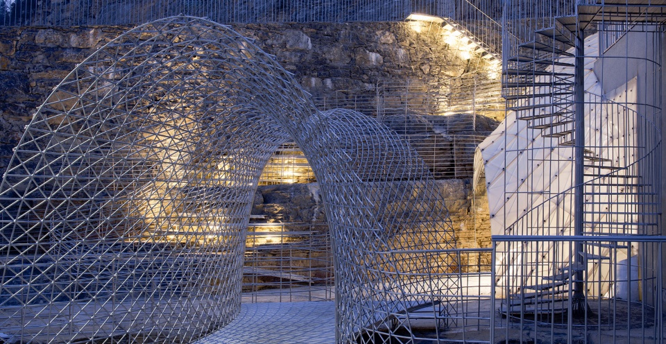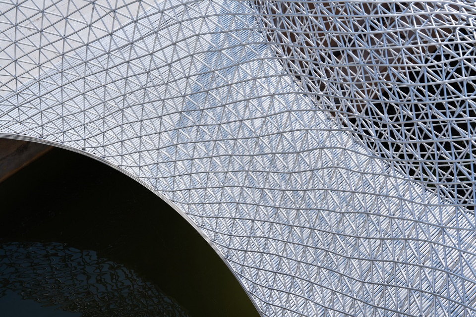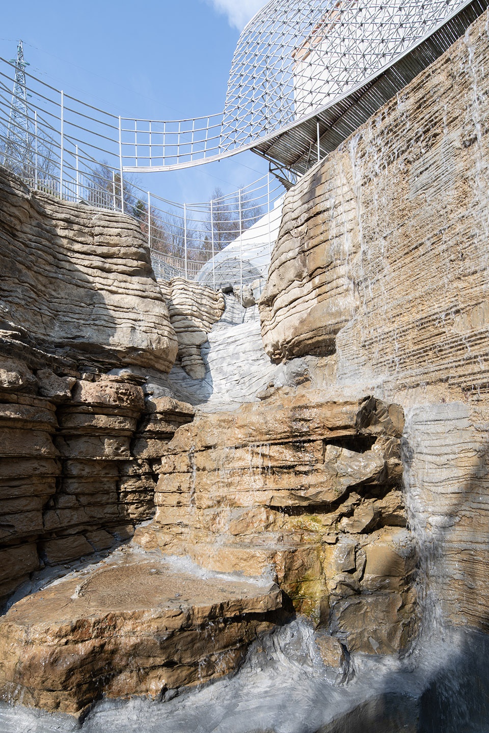 A natural gap between the pedestrian walkway of the commercial street and the stone platform at the bottom of the cliff has been cleverly utilized. A pool has been dug here to channel the waterfall, and a covered bridge has been built at the top of the cascading waterfall. This covered bridge is constructed with a transparent network structure made of woven reinforced steel. When sunlight passes through the network, it casts dappled and intertwined light and shadow on the metal bridge deck, like flowing pieces of gold, creating a dreamlike scene. Looking up from the bottom of the valley, through the hazy water curtain at the covered bridge, the flowing waterfall and the network – like shadows complement each other, forming a vivid and dynamic picture.
