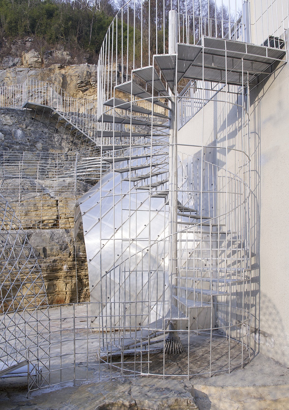在商业街的中心位置,预留了一个天然的通道。通道连接了商业步行街与商业街后方的交通,既作为上下交通空间,也作为咖啡馆的户外空间。中心通道由系列平台组成,半数以上岩石保留了原始状态:这些石灰岩是恩施富有特色的沉积岩,其表面肌理犹如千层饼,层层累积并沿横向展开。经过局部雕凿,通道形成了四层不同标高的平台。曲线钢筋为材料的台阶衔接高差上的通达,通过打孔的方式锚固在岩石上。台阶立面钢筋的肌理和岩石的千层饼结构一致,连续的平台栏杆突出横向的线条的连续性,与岩石形成语言上的呼应。为了上部道路的稳定性,通道的左上方砌筑了石墙,步道也自然从人工石墙上生长出来,钢筋线条的光影投射在岩石上形成韵律感,坚硬粗犷的岩石与细腻柔和的钢筋形成对比。
