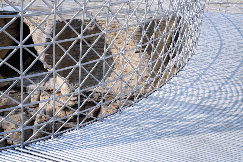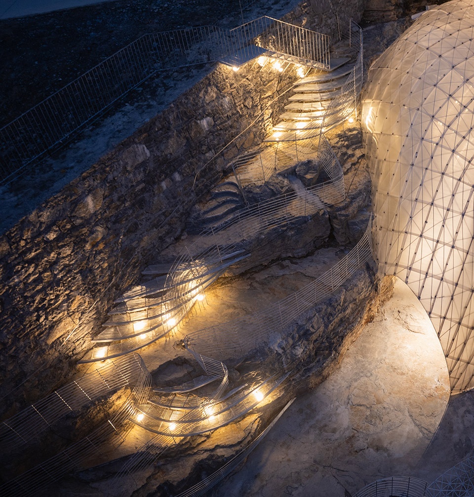The core café, supported by the cliff and the street’s elevated floor, forms a unique “suspended-grounded” space. Its cliff-side interface has two treatments: one uses artificially carved original rock (with natural height difference and stone platforms as cliff seats); the other uses inclined stone walls as indoor walls to minimize intervention. The roof over the open area between the cliff and elevated floor, a combination of steel grid and honeycomb polycarbonate panels, extends indoors to form a continuous dome, defining boundaries and ensuring integrity. Three semicircular cliff platforms (coffee seats) connected by a winding boardwalk require precise steel implantation and construction sequence control, showing craftsmen’s skills.