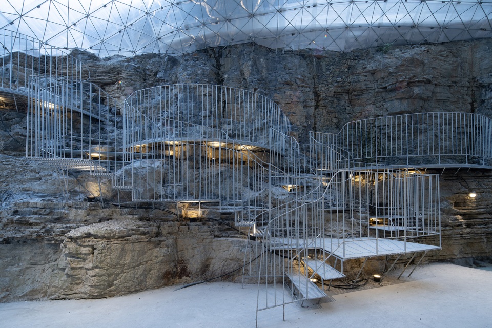 In line with the overall design language, a reinforced steel spiral staircase connects the first – and second – floor platforms of the commercial street. The spiral – ascending lines not only connect the covered bridge but also seamlessly link to the indoor entrance of the Grotto Café. This allows several transportation spaces to permeate and overlap with each other in a flowing manner, forming a transitional sequence where every step presents a new view.