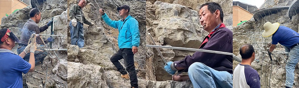 这是一个在地设计与营造的项目,所有的建造和空间都因循复杂的地形展开。施工团队由项目周边村落的土家族村民组成,师傅们具有匠人精神,参与过恩施大峡谷的悬崖栈道施工,对于在坚硬的岩石上植入钢筋以及钢筋焊接有着丰富的经验,施工期间,与工匠团队的日常沟通成为常态,其中不乏有趣的思路碰撞。