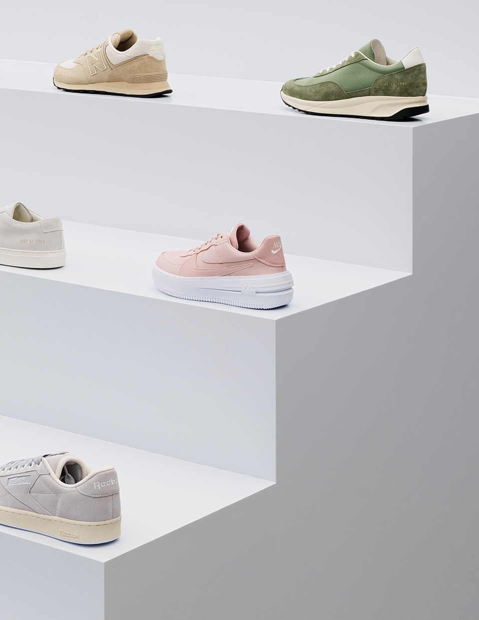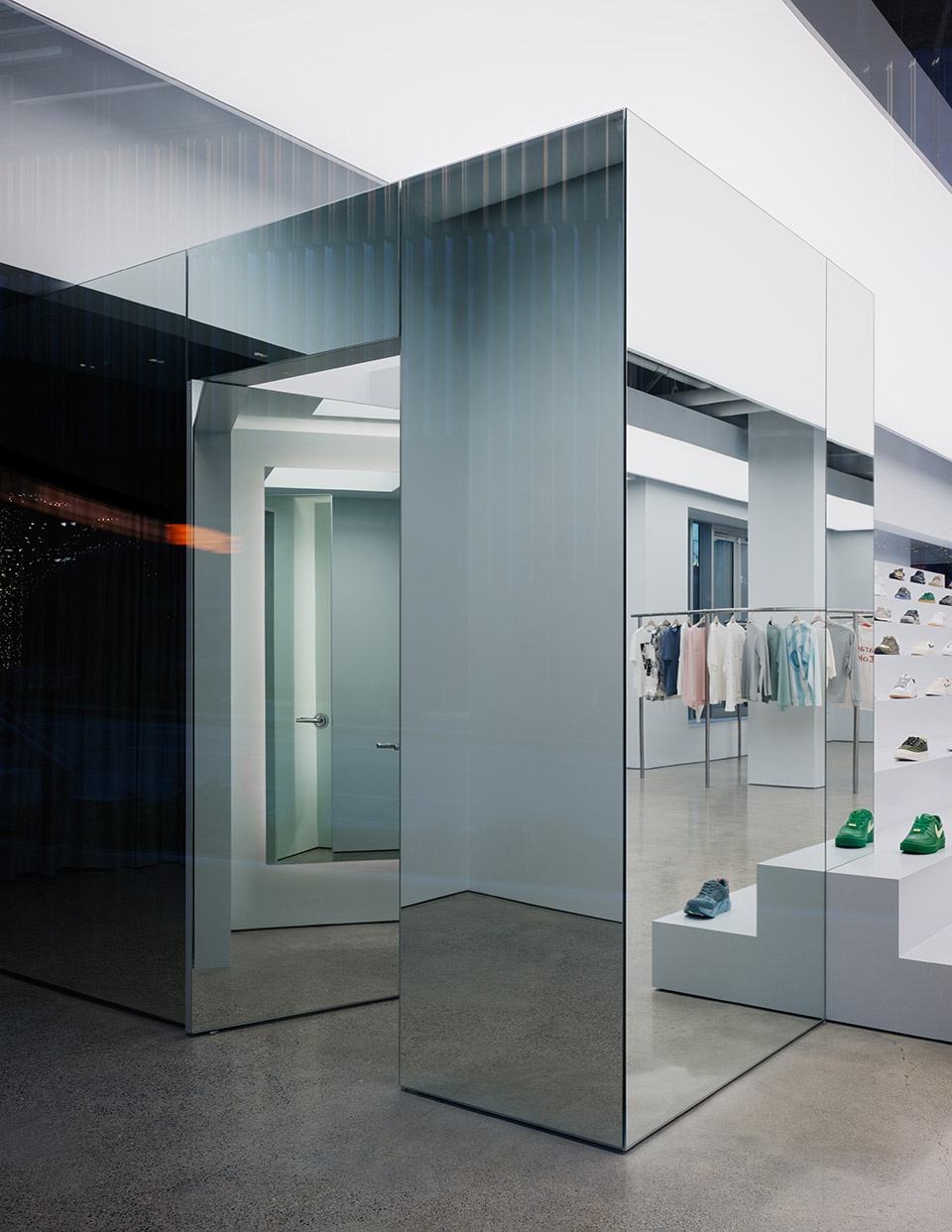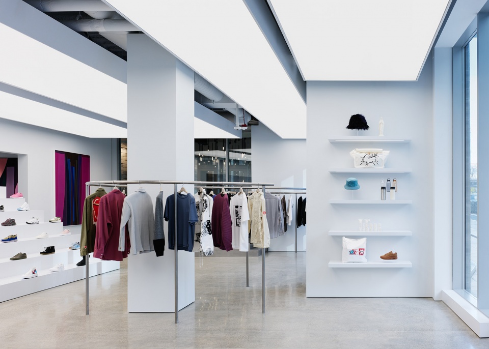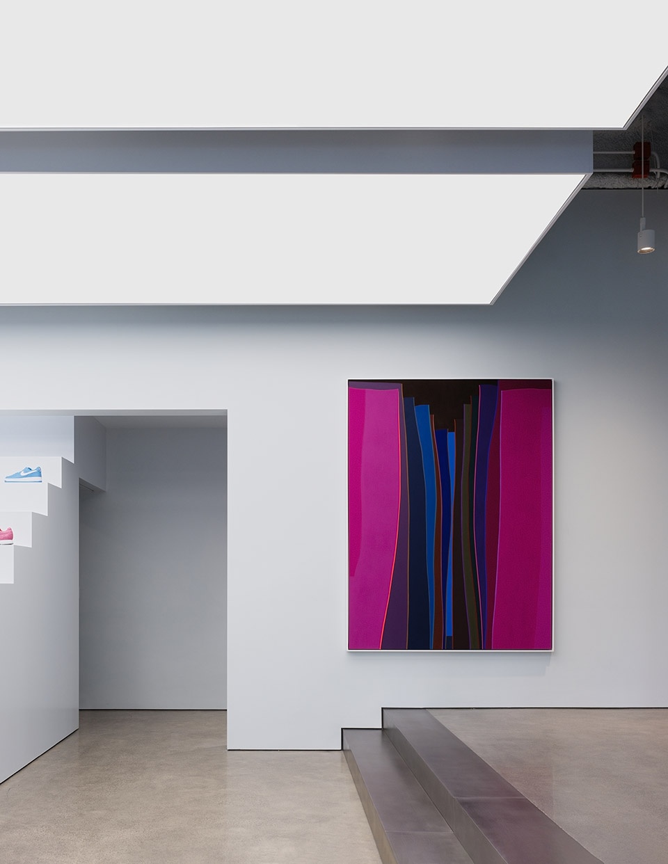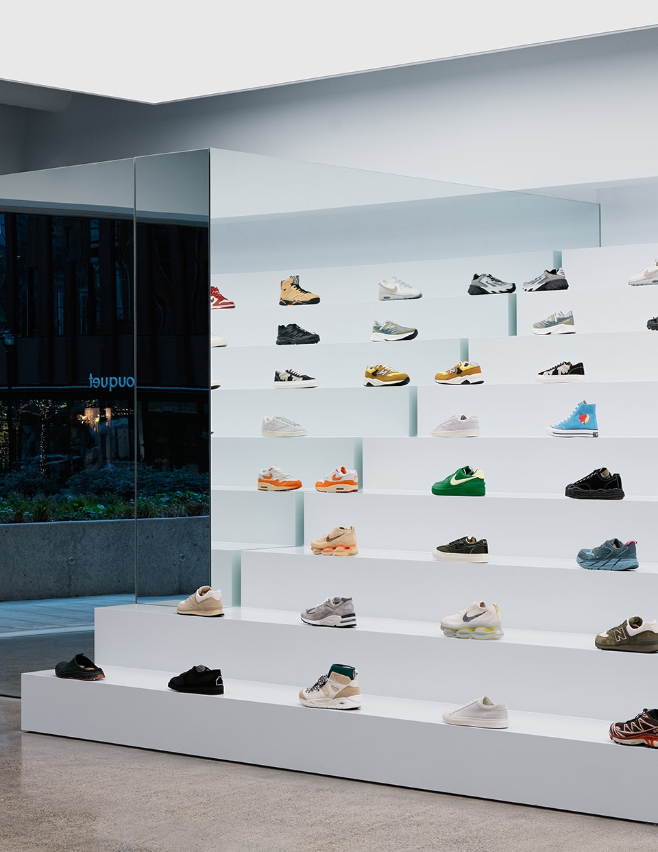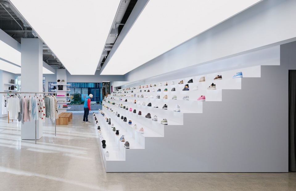 The store design is inspired by an art gallery, with bright white walls and displays, mirrored dressing rooms, and a ceiling of “cloud lights”. The minimal palette and abstracted materials provide a stage for the colorful brands. The signature element of the space is a tiered stadium display, a massive central staircase that’s peppered with shoes, running 36-feet-long, conceived as a single monolithic form – flawless without seams or joints. Highlighting the stadium are the internally illuminated ceiling panels that flood the products below in a brilliant glow.
