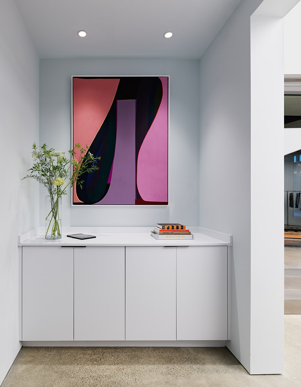 The gallery-like space is punctuated with reflections bouncing from the mirror-clad fitting rooms, the illuminated floating shelves feature coveted fragrances, and a serpentine stainless-steel garment rack weaves throughout the store, holding a continuous display of apparel. Works by local artists bring warmth to the space such as a custom white oak bench for fitting shoes, the Douglas fir vitrines bring accessories and jewelry up close for viewing, and the vibrant paintings of Brian Sanchez compliment the products.