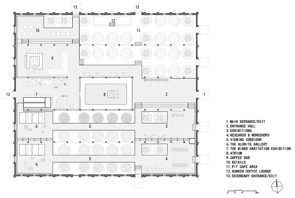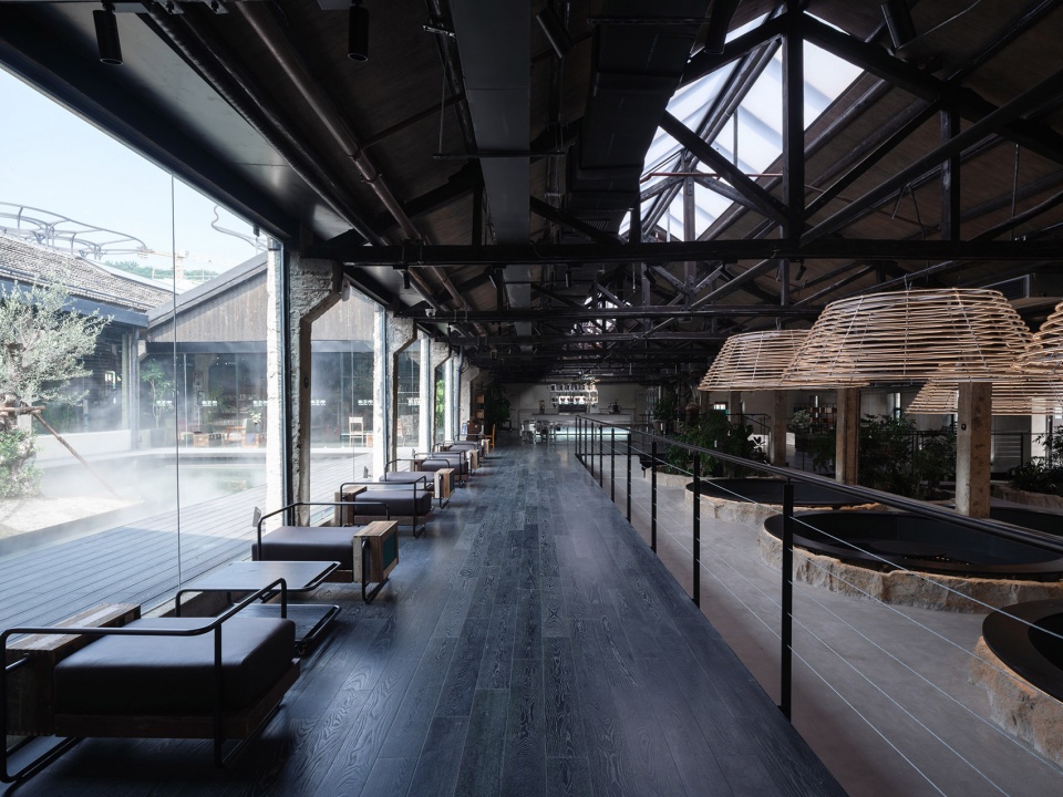 保育其形,活化其神,植入其用,最终导向的是遗址及其所在区域整体的“焕新”。这种焕新是深刻而多维的。矿坑从废墟中重生,成为充满活力、可游可赏可用的文化地标。设计的介入不止于文化层面焕发新意,更将生态修复纳入其中:巨大的圆坑,一部分置入明矾晶体重现结晶池结晶的过程,一部分形成结构脱开的咖啡区卡座,还有一部分则引入室内植物景观,化作涵养水土、孕育微小生态的“自然的容器”。在这种层层递进的更新逻辑中,工业遗址逐渐蜕变为具有生态韧性的基底。