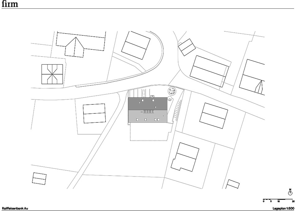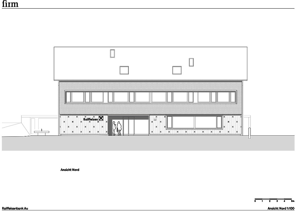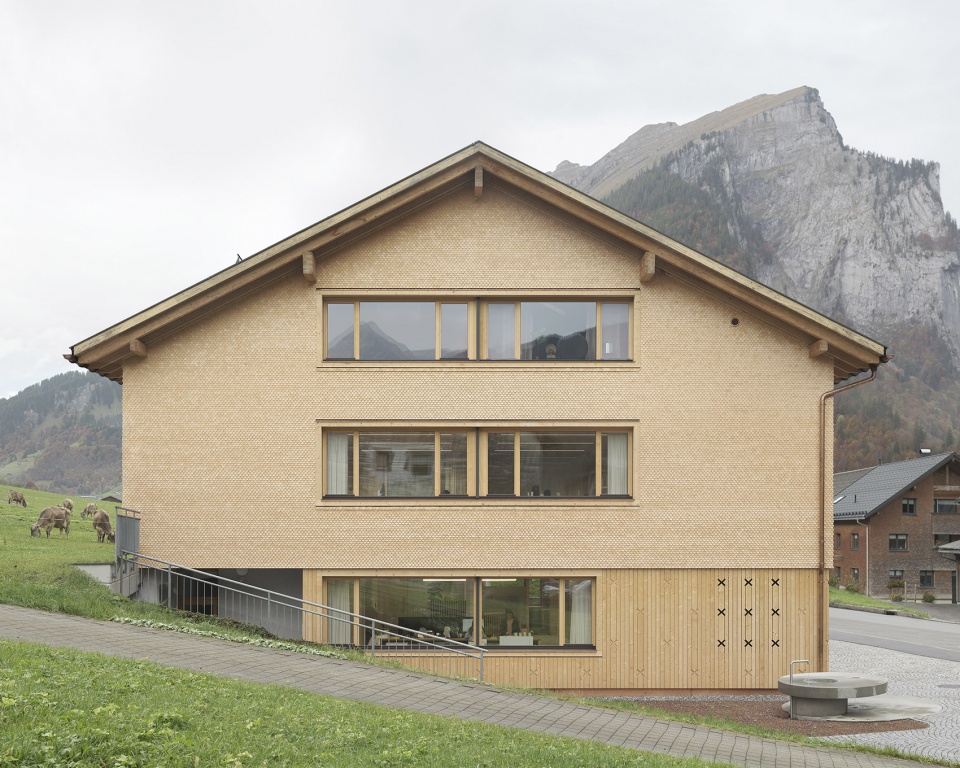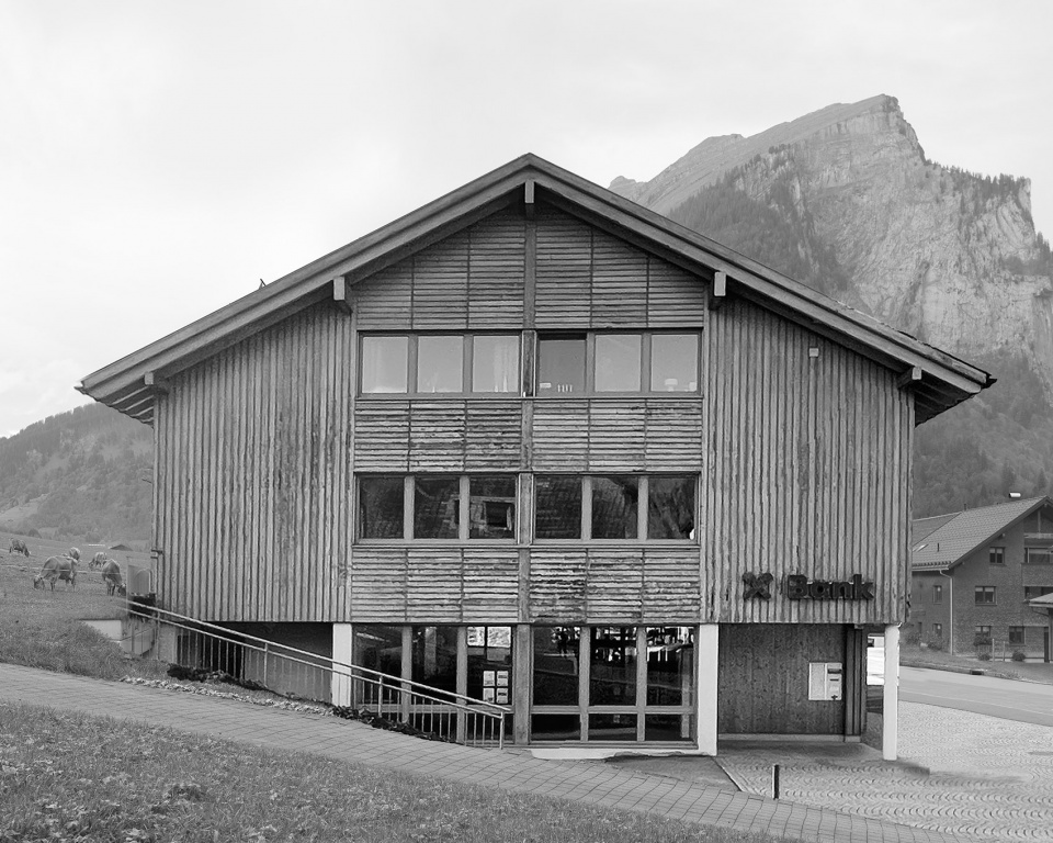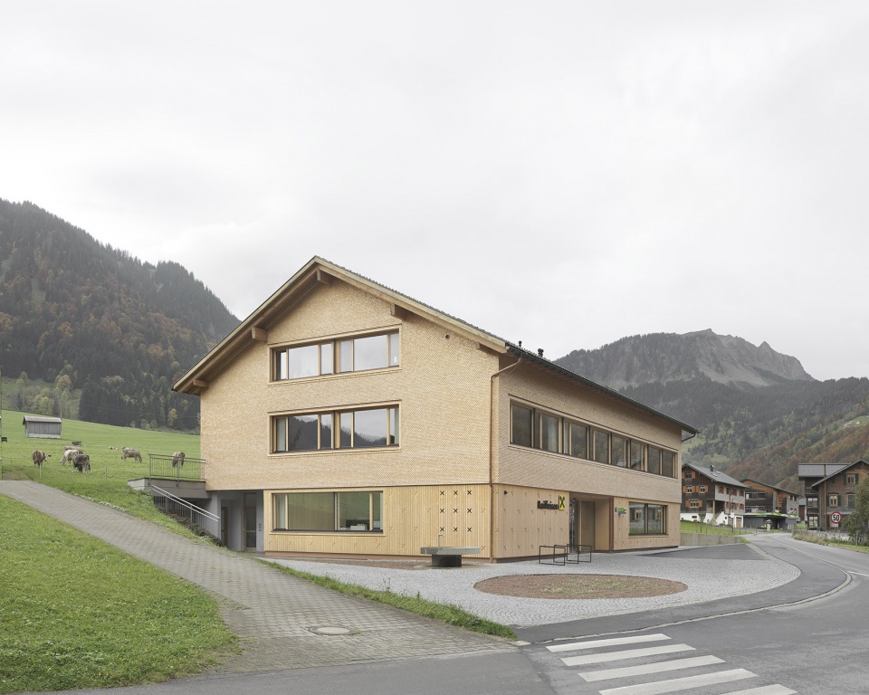 The bank building in Au is centrally located in the village at the junction to the Faschina Street. The newly aligned main entrance opens onto the street and has more presence. The external appearance is characterized by the base with a vertical spruce screen and milled ornament. The window openings on the upper floors were framed together. In combination with the round wood shingles made of fir wood, the building appears clearly structured, becomes visible as a public building and is regionally located through the choice of materials. The energetic renovation includes the renewal of the facade insulation and windows, as well as the installation of cooling ceilings and a photovoltaic system.