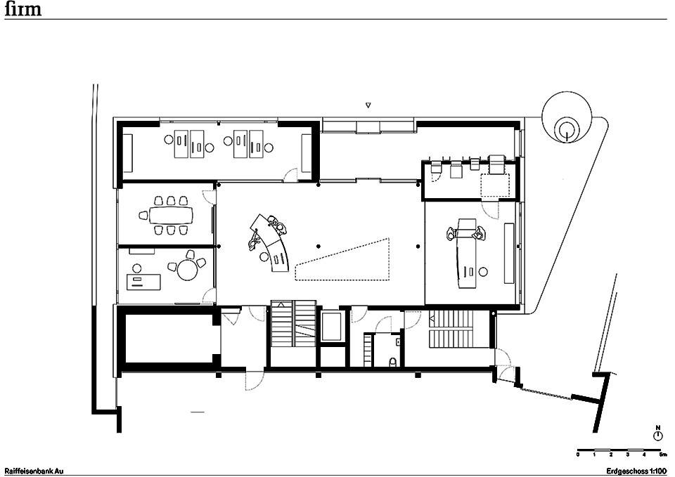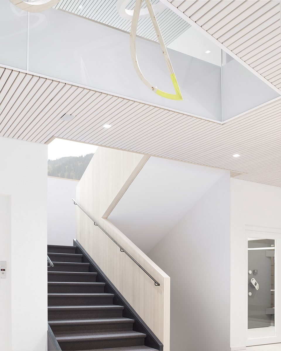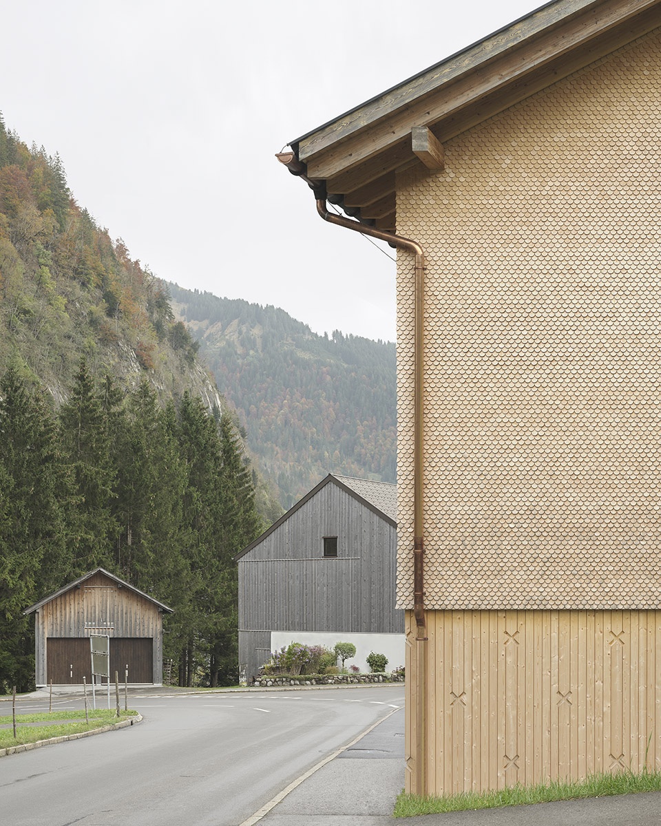 The bank building in Au is centrally located in the village at the junction to the Faschina Street. The newly aligned main entrance opens onto the street and has more presence. The external appearance is characterized by the base with a vertical spruce screen and milled ornament. The window openings on the upper floors were framed together. In combination with the round wood shingles made of fir wood, the building appears clearly structured, becomes visible as a public building and is regionally located through the choice of materials. The energetic renovation includes the renewal of the facade insulation and windows, as well as the installation of cooling ceilings and a photovoltaic system.