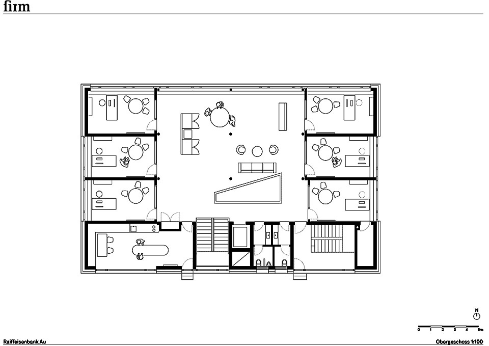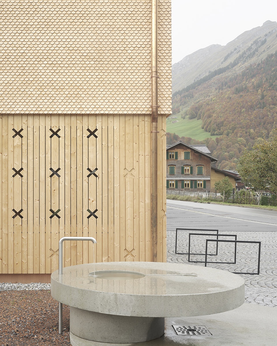 位于Au的银行网点坐落于村庄中心,正处于通往Faschina大街的交汇处。重新调整后的主入口面向街道,具有更强的存在感。建筑外观的特点是底层采用竖向云杉格栅并饰有雕刻纹样。上层的窗洞口被统一框合。结合以冷杉木制成的圆木瓦片,建筑呈现出清晰的结构秩序,既彰显为公共建筑,同时通过材料选择牢牢扎根于本地语境。节能改造包括更新外立面保温层和窗户,以及安装冷却天花系统和光伏发电系统。