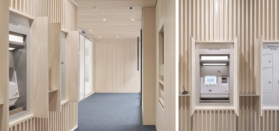 If you enter the bank building through the vestibule with a service zone, you reach the entrance hall with two points of contact. On the one hand, the customer is served at the counter with a high level of privacy. Opposite is the reception desk for registering for customer appointments or other concerns. On the upper floor, customer consulting services take place in modern offices. There is a waiting and lounge area in front of it.