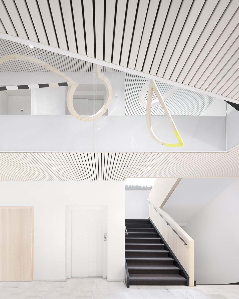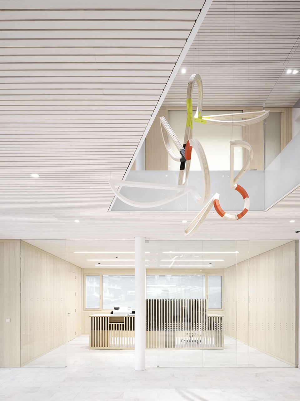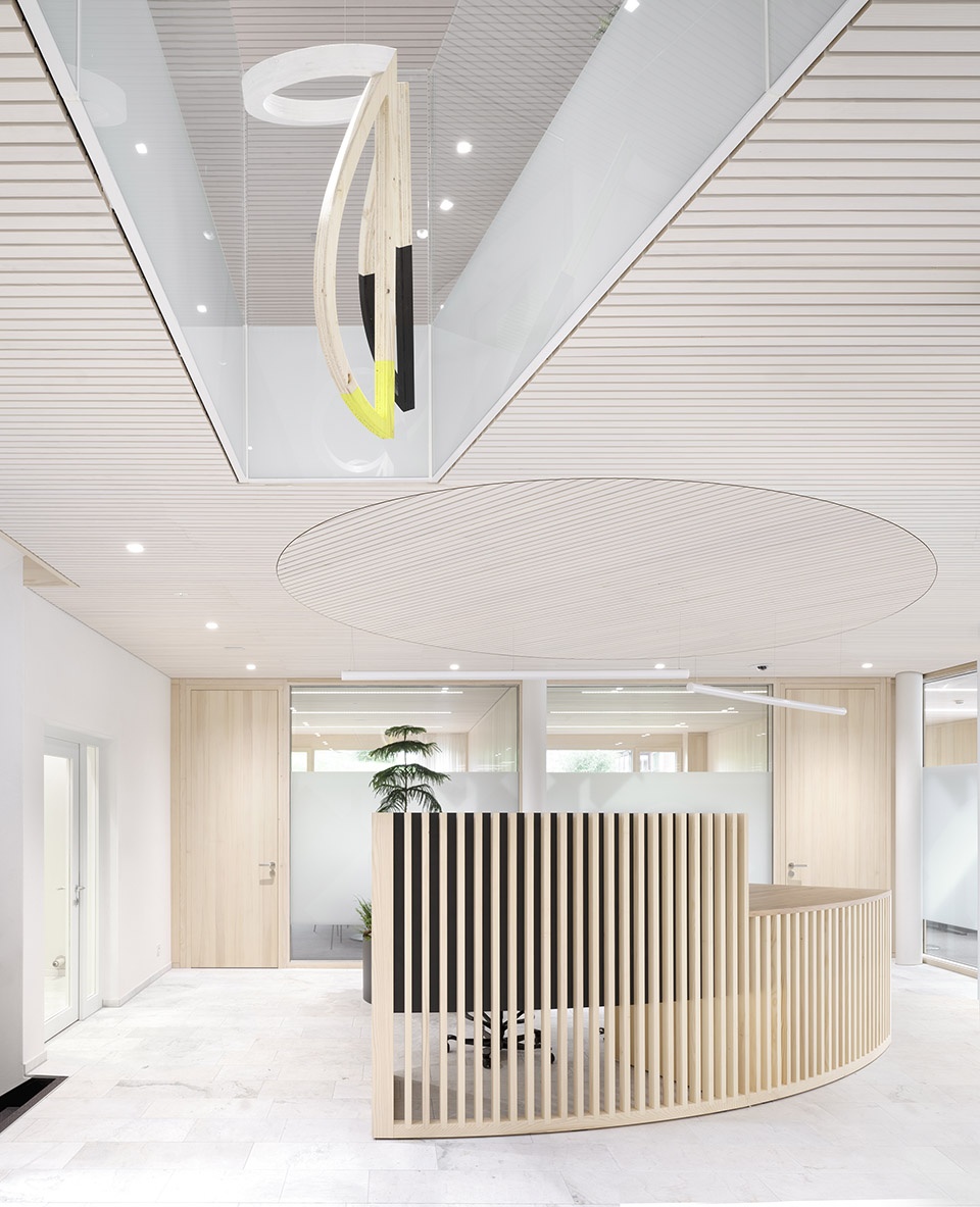 整体设计印象以开放与透明为特征,力求营造出友好而高质的氛围。一层地面铺设天然石材,墙面采用天然松木饰面板,白色釉面的声学条板天花同样由松木制成,桌面则选用榆木。现有的墙体元素覆盖以打磨平整的石灰抹灰。设计过程中尤为重视灯光与家具的整体概念,以便在清晰平静的整体氛围中营造对比、清新与多样的细节亮点。