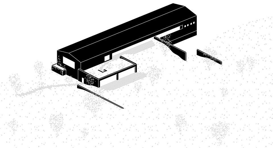 The architectural mass intertwines two volumes: the original hall with its traditional gabled form, and a new concrete “embrace” opening the building to the landscape. This draws the meadow right up to the building, and from the offices five metres above ground one steps directly onto it. Originally, the hall was separated from the meadow by a road and a fence, enclosed by walls.