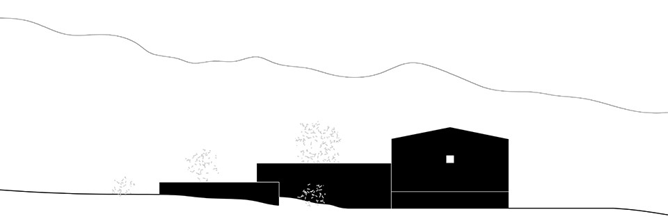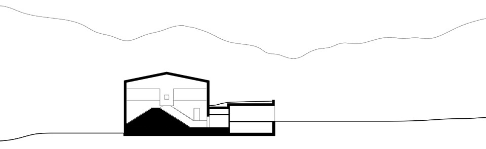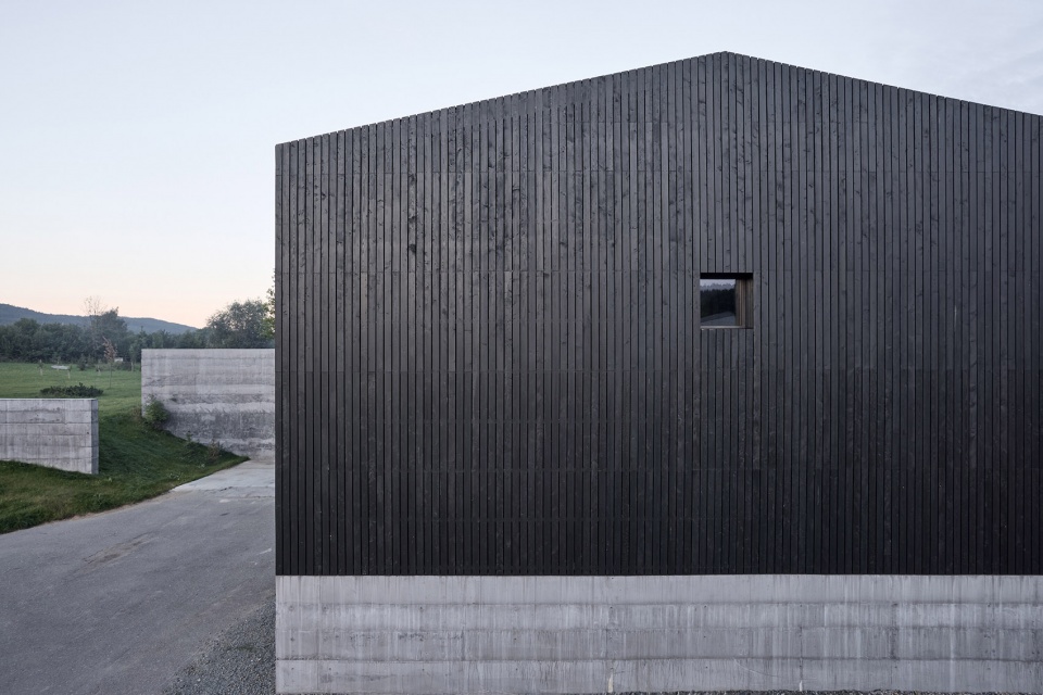 The form of the original hall has been reduced to its most essential lines, highlighting the dialogue of the two volumes. From three sides the building appears as a monument; towards the landscape, softened and pushed into the terrain, it becomes a light horizontal line.To highlight the steel structure inside, the hall was insulated from the outside and clad in black-painted timber. Four cut-outs were carved into this wooden volume. A single large window is on each gable end. The largest—measuring 9 × 3.2 metres—is on the main façade, revealing what happens inside and serving as a clear sign for visitors. On the opposite side, by contrast, appears the smallest picturesque window.