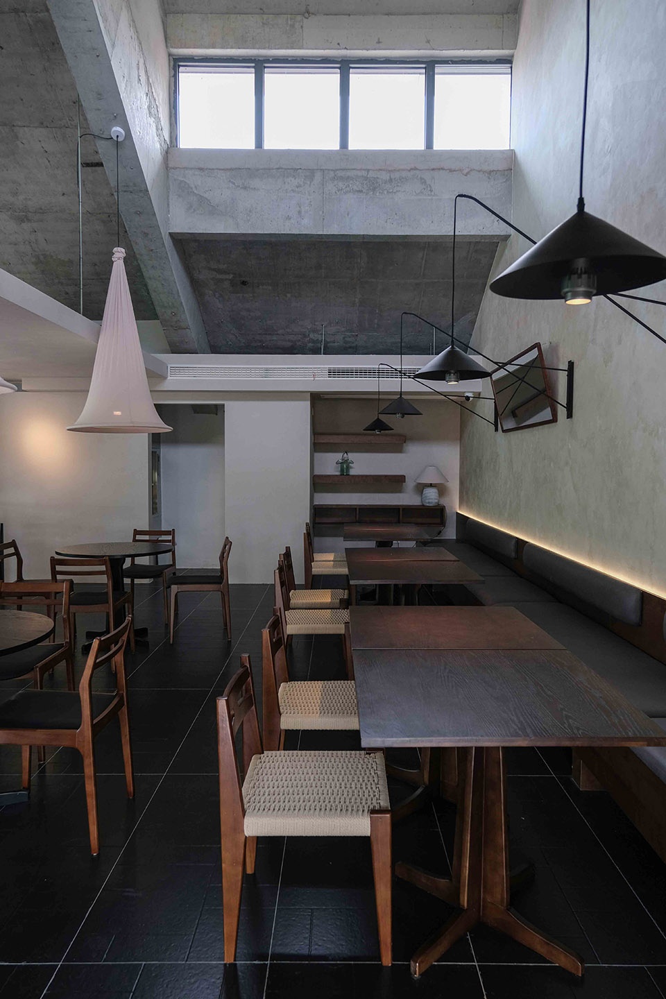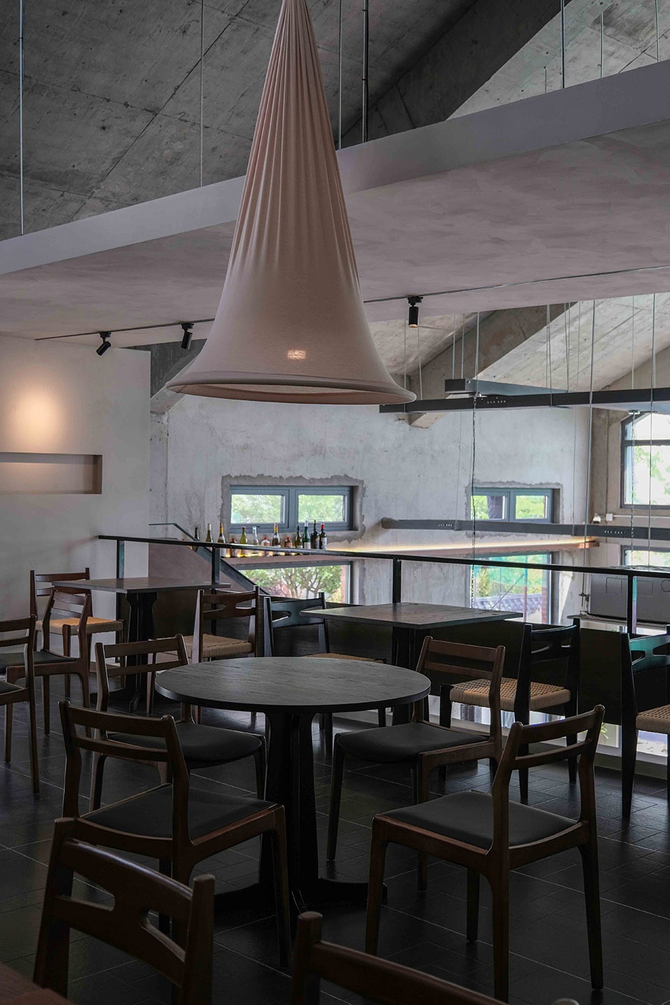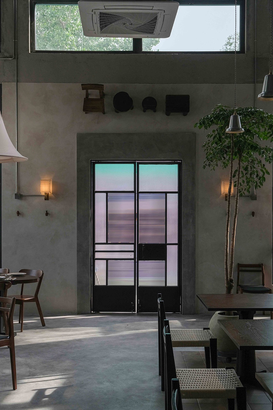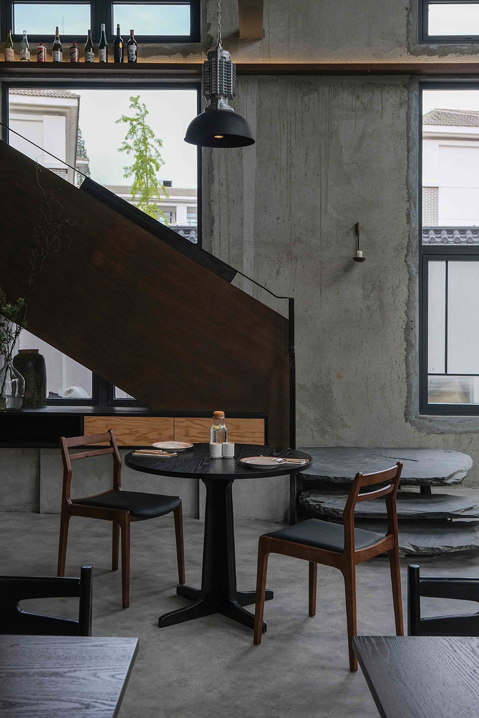 下午的阳光从天窗倾泻而下,光带在灰色墙面上描绘出斑驳的画面,点亮桌角的木色,也在水泥地面上投下有力的棱影。那是和风与工业的碰撞,是光与影的对话,更是时间与空间的一次静默共舞。