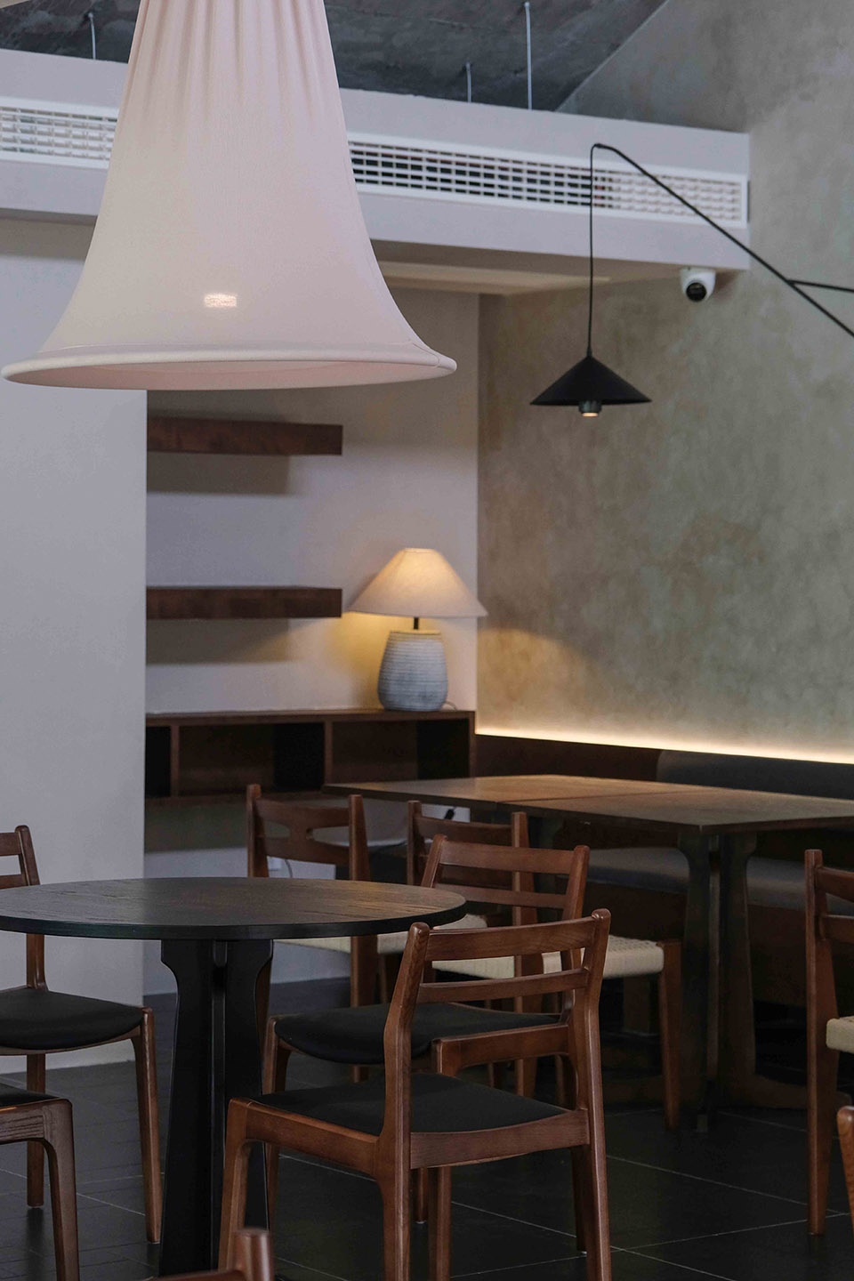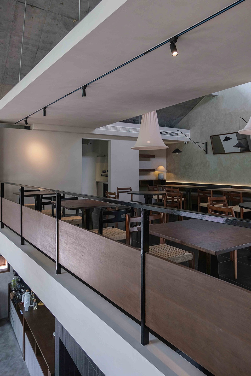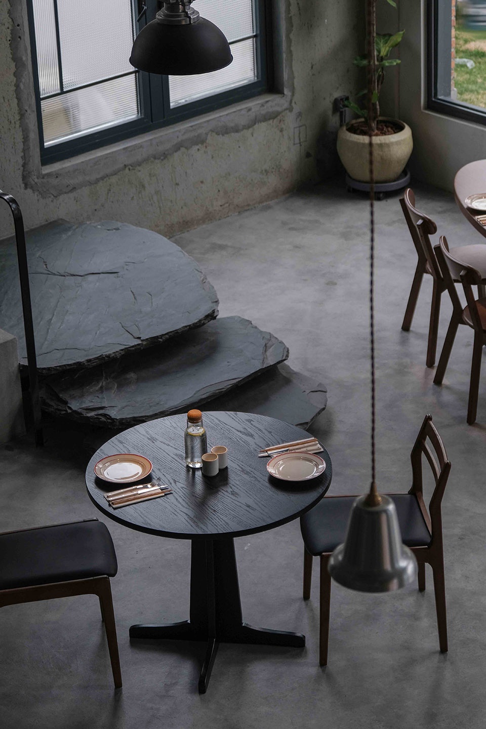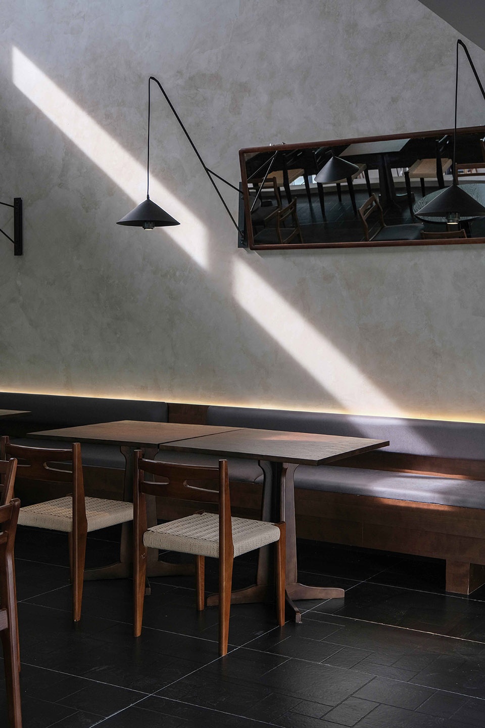 下午的阳光从天窗倾泻而下,光带在灰色墙面上描绘出斑驳的画面,点亮桌角的木色,也在水泥地面上投下有力的棱影。那是和风与工业的碰撞,是光与影的对话,更是时间与空间的一次静默共舞。