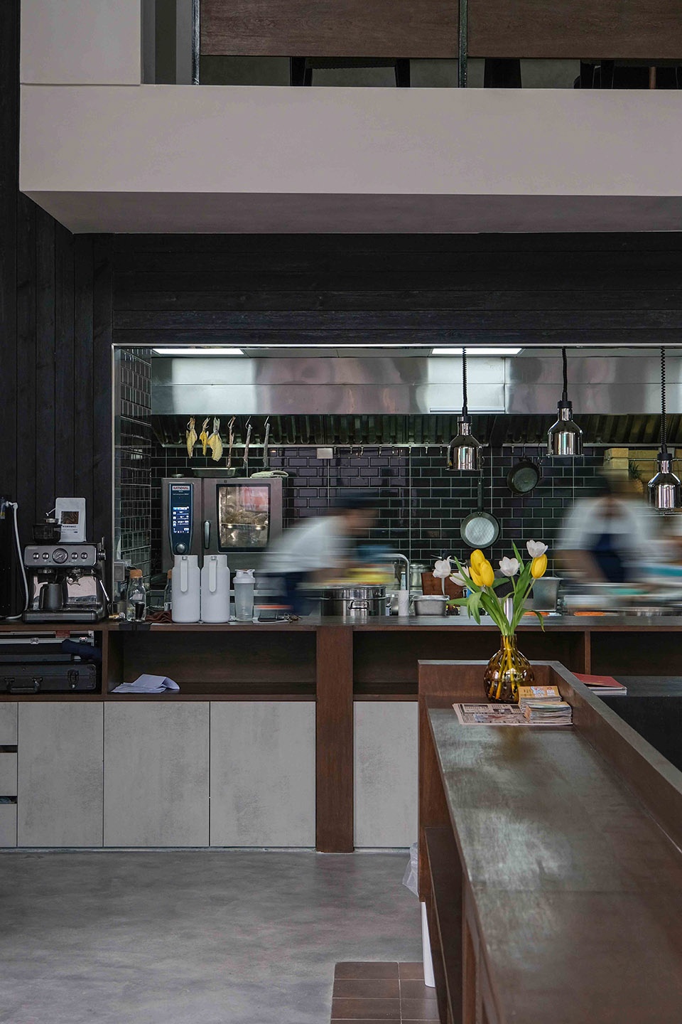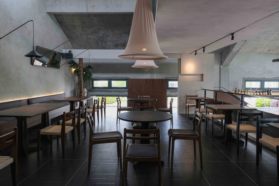 Pushing open the door, one is greeted by soaring ceilings and exposed beams and columns, where shades of black and gray shimmer with countless layers under the natural light.The open kitchen on the left resembles a stage, where chefs bustle about. Copper pots clink softly as they clatter together, while steam and cooking smoke mingle with the savory aroma of sauces, rising to linger on the guests’ palates.
