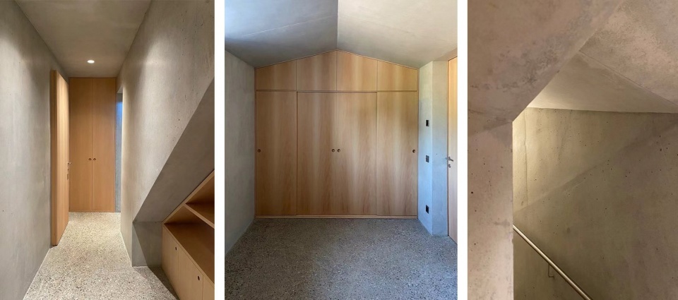 The project develops vertically, following the logic of the slope, like an ascending path of living. At the base, the concrete plinth is immersed in the earth, housing the sleeping area and garage. The architectural body then opens upwards, culminating in a bright, open space that accommodates the living area: a domestic observatory facing the landscape.