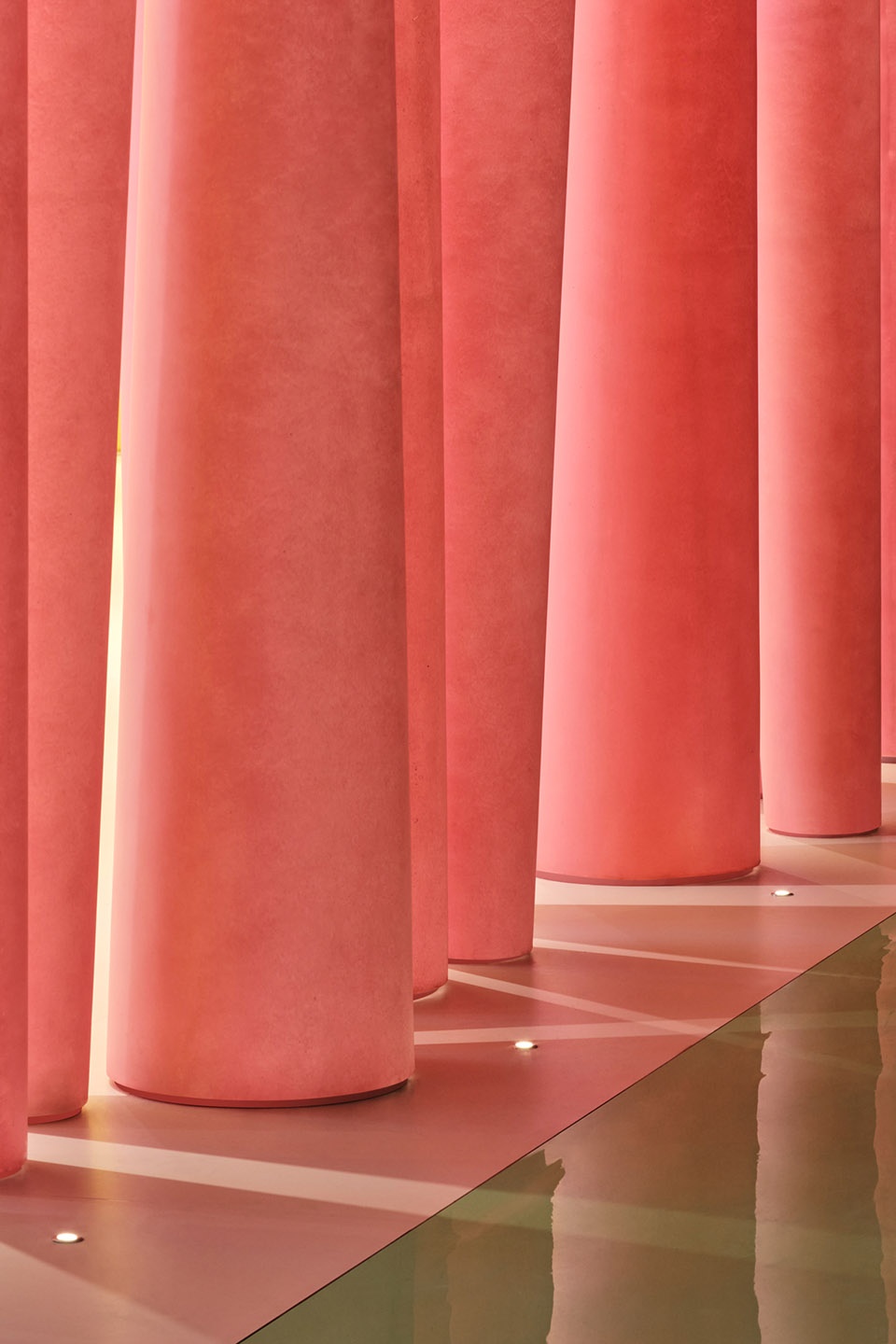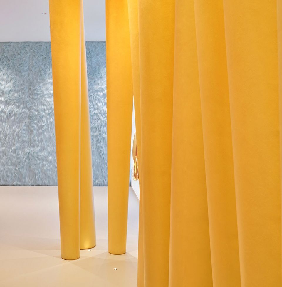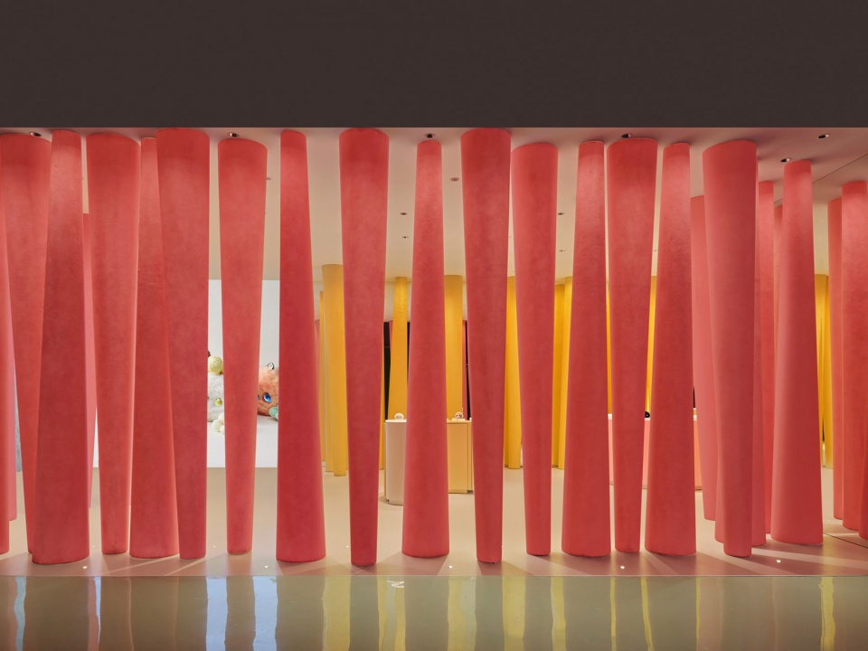 空间色彩上,考虑到品牌的主要消费群体年龄跨度较大,以 5 岁至 30 岁的女性为主,我们选择了柔和且具有亲和力的彩色搭配。粉色与黄色的组合被用来营造一种梦幻而温暖的森林氛围,使空间既充满趣味性,又能适应不同年龄段消费者的审美偏好,从而增强沉浸体验感。