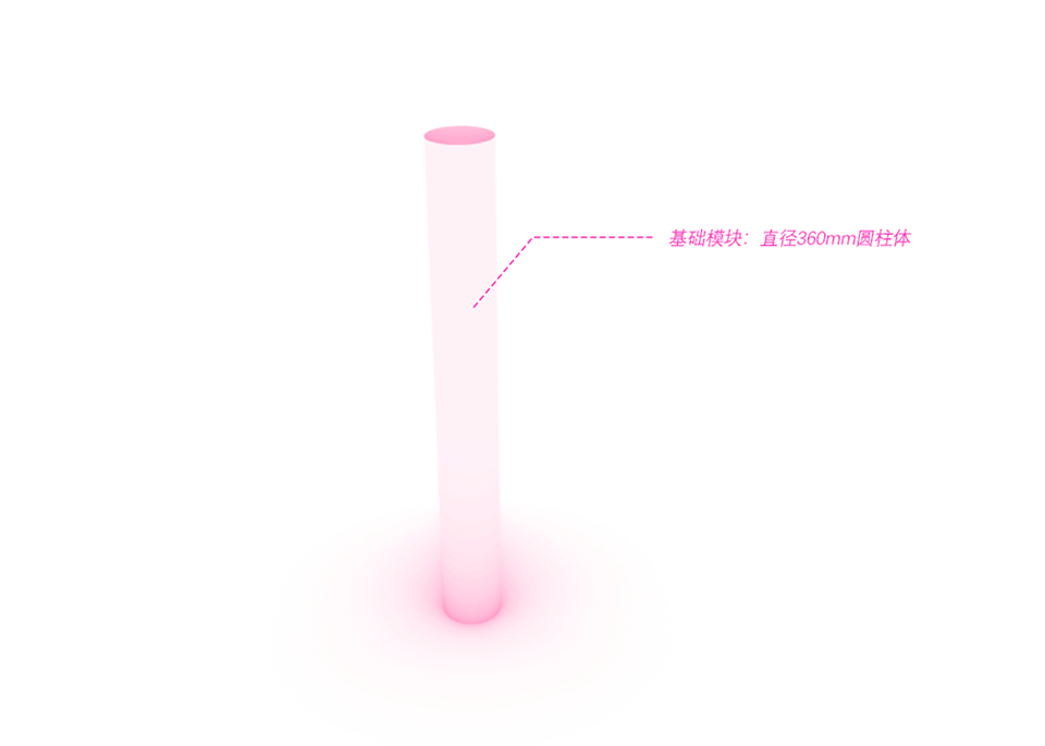 基于此,从项目落地的角度出发,我们设计了一个以单元模组为核心的构建策略。该模组为直角斜圆锥台,上口直径180mm,下口直径360mm。借由其特殊的几何特征,我们在空间中将其上下倒置、并通过不同角度的旋转排列,使得从人视角望去时,能够形成层次丰富、极具动态感的立面效果。