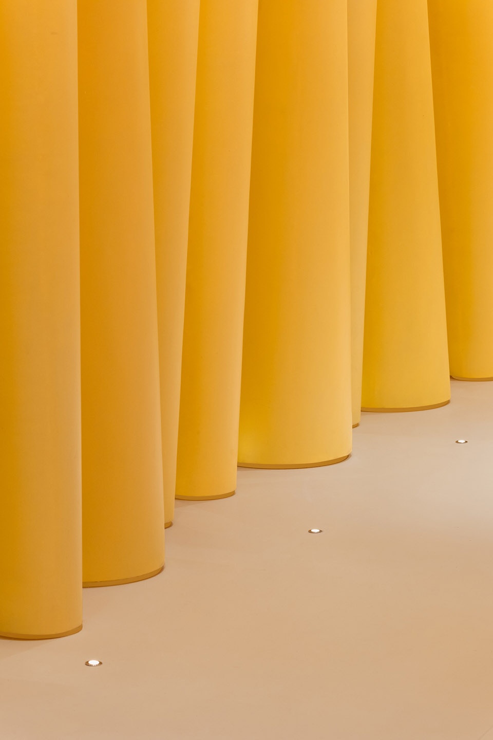 材料选择上,我们最初的设想是气模结构,内部加入射灯,以营造柔和朦胧的效果。然而,考虑到实际使用场景中存在消防规范的限制,以及场内儿童较多所带来的安全性要求,我们最终放弃了这一方案。最终改为了彩色树脂纤维玻璃钢,作为一种硬质且半透明的材料,既可以呈现出朦胧的质感,同时在稳定性和安全性上也能够顺利满足消防审核的要求。