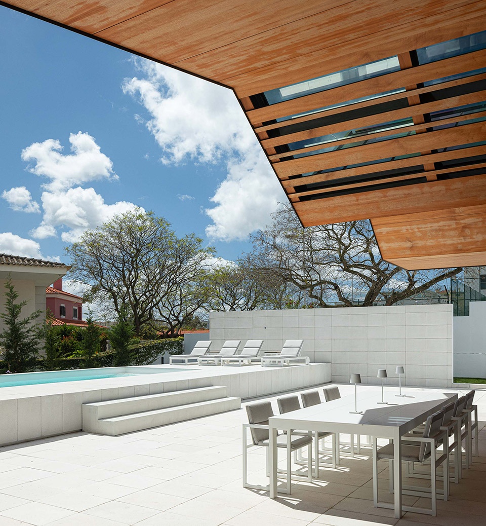 住宅顶部是极具特色的屋顶,其灵感来自葡萄牙乡村建筑、热带植被与悠闲生活方式。屋顶展开为一片折叠的双坡屋面,外覆锌板,内衬胡桃木。屋顶的几何形态中精心布置了开口,通过木格栅,为住宅提供了富有诗意的天空掠影。