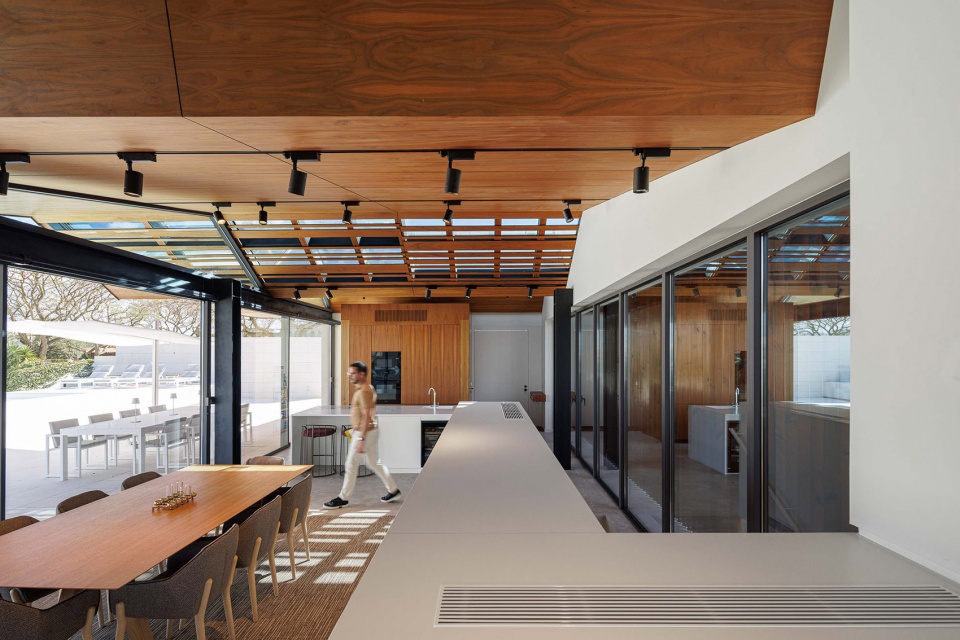 住宅向景观敞开,同时巧妙屏蔽了来自邻里的视线。泳池所在的侧向露台与一系列阳台共同定义了项目的建筑姿态:流动、开放、界限模糊的空间,旨在呼应业主对更自由、更具联结感生活方式的愿景。