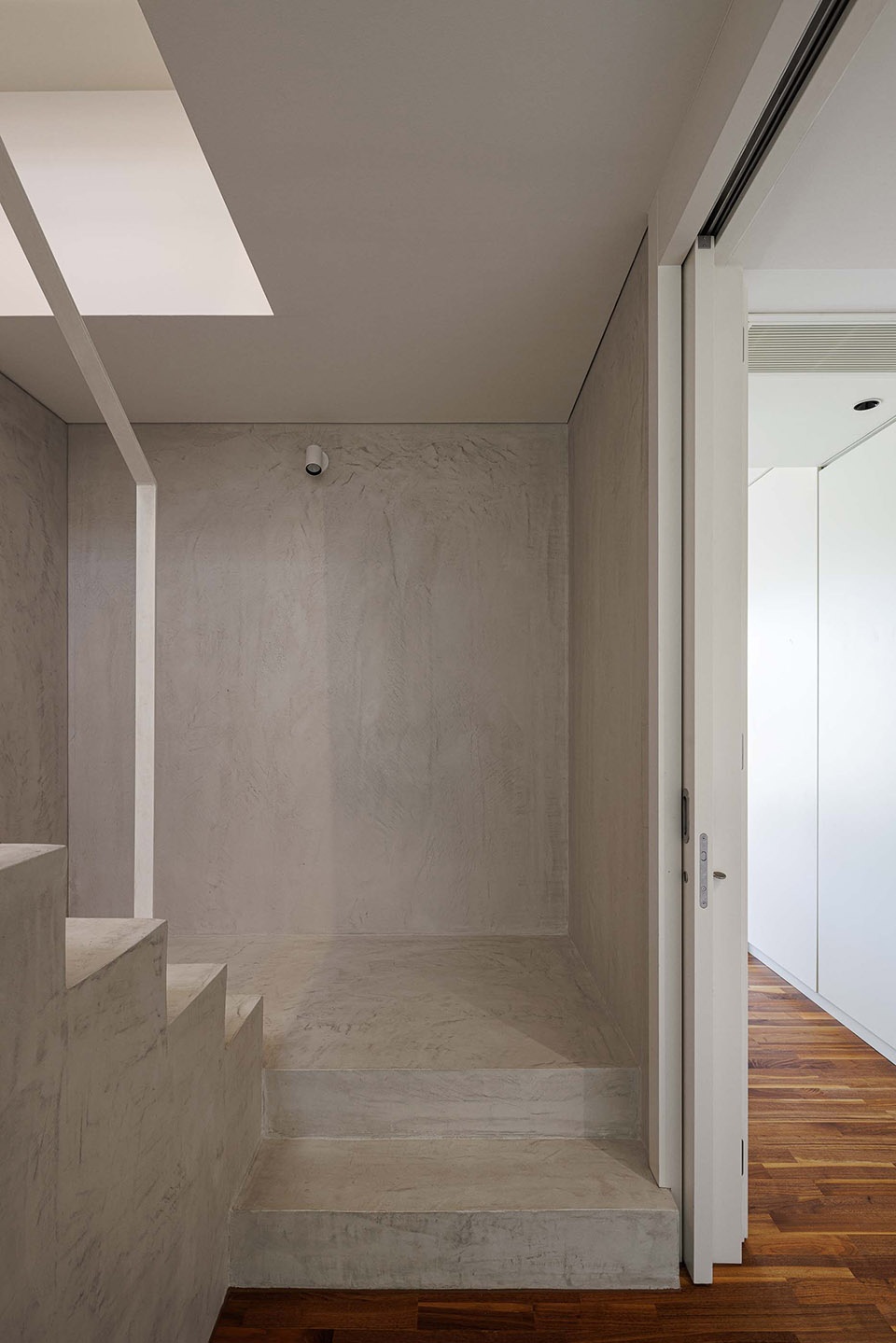 A restrained material palette—white plaster and ipê wood outdoors, microcement and walnut indoors— emphasizes the balance between architecture, atmosphere, and the natural setting.