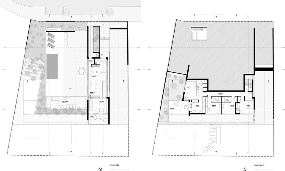 This residence is located on a sloped plot within a golf course, with a seven meter level difference that shapes its spatial organization.