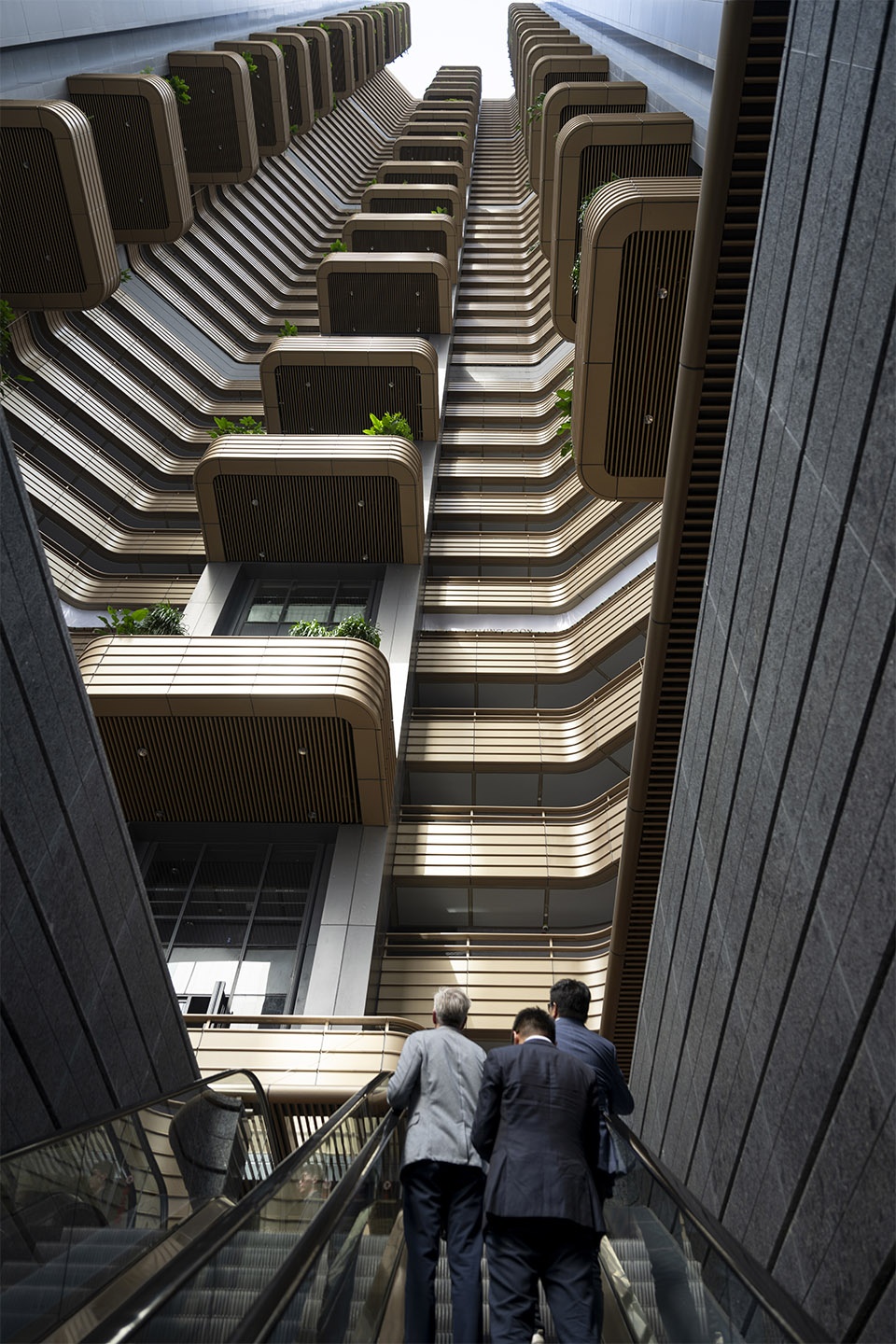 项目中的两栋高达180米的住宅塔楼由一座大型半公共花园相连,并与周边绿带相接,延伸了地面层的使用体验。二层平台与桂湾的高架步道网络无缝衔接,形成邻近地块之间的过渡空间,同时为公众打造了可享用的绿色城市绿洲。随着住户在楼内向上移动,各层的绿色露台提供共享的公共休憩空间。柔和的植物景观营造出宁静的氛围,当住户从电梯中走出时,便能感受到设计带来的安定与舒缓。