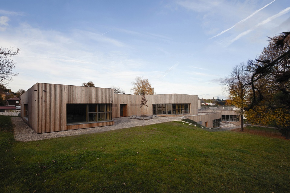 位于Fulnek的新幼儿园坐落在基地北侧,依偎在一片广阔的花园之中。它既拥有充裕的活动空间,又享有开阔的景观视野——整片南立面完全向景观敞开,远眺小镇对面山丘上那座庄严伫立的城堡,这一地标建筑成为孩子们日常生活的背景。