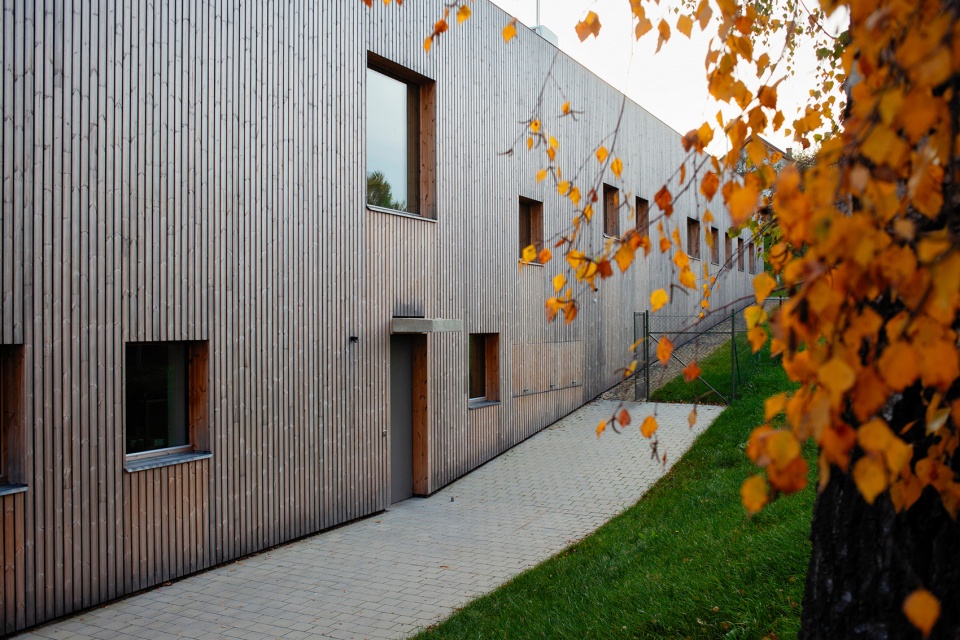 The building’s elongated form is organized into two functional zones: children’s spaces and service areas. The kindergarten is horizontally connected by a corridor and vertically by a central staircase hall. Four classrooms are located on the ground floor, paired around shared outdoor atria, which also function as semi-sheltered entrances. Through these glazed vestibules—visually connected to the classrooms—children move into their individual cloakrooms, gradually transitioning from public space into their familiar environment.