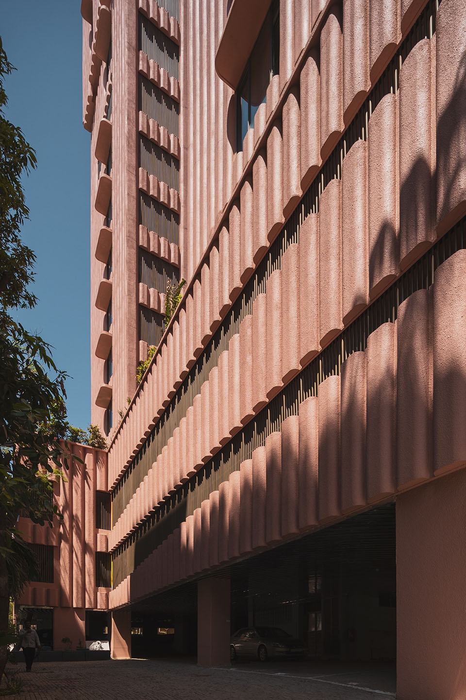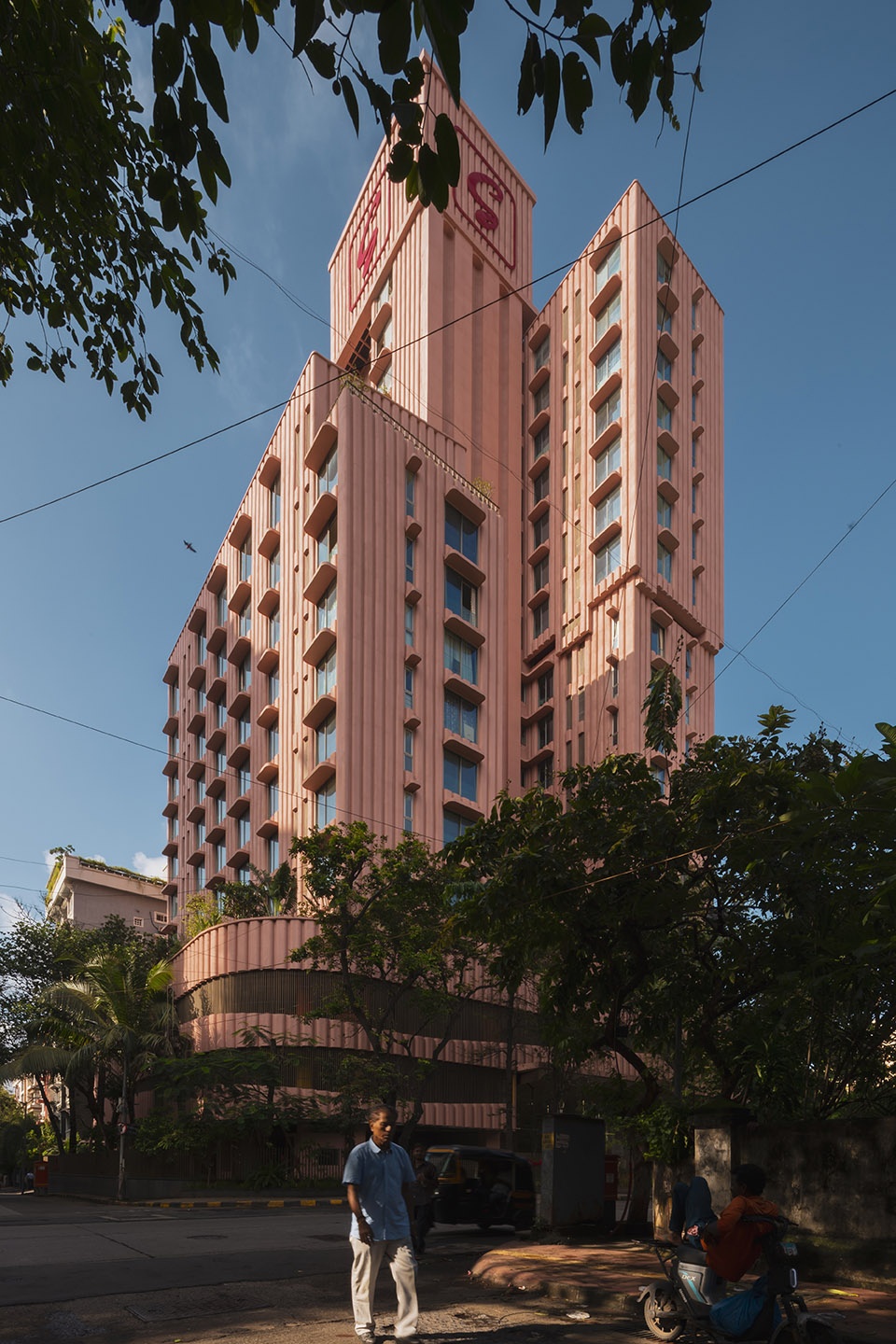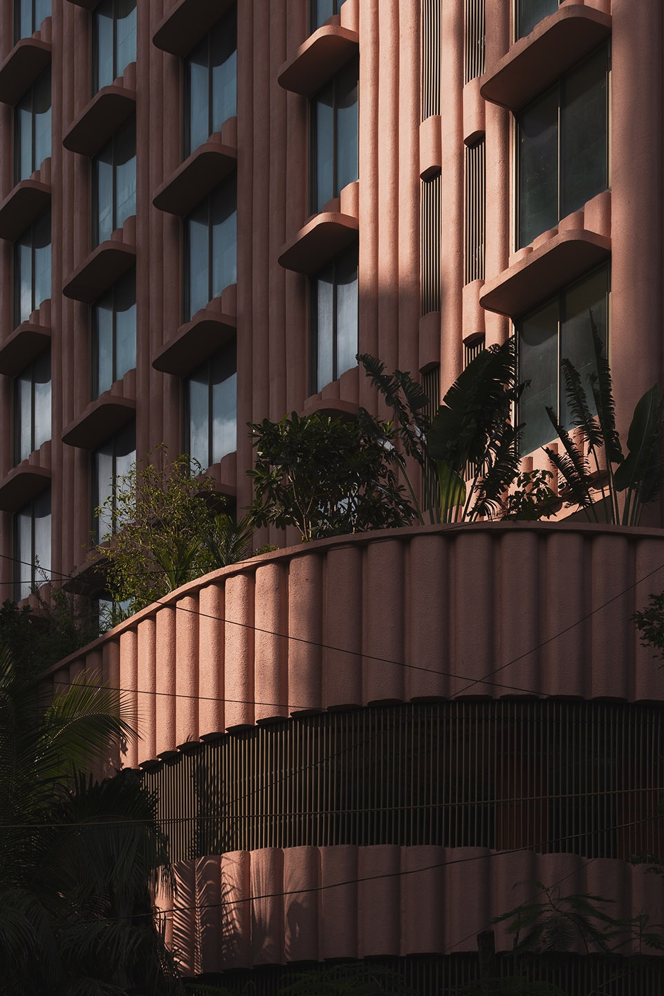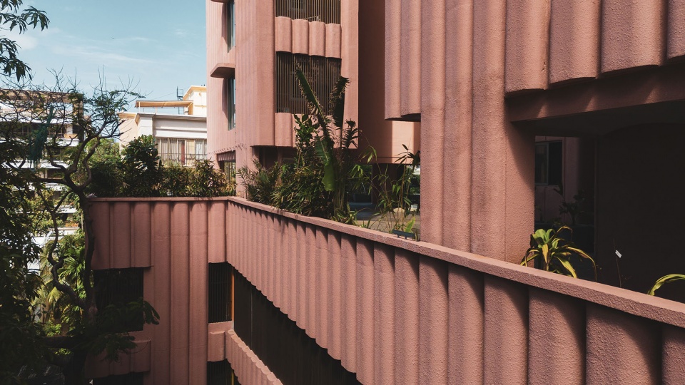 Drawing inspiration from India’s national flower, the lotus, the concrete facade is rendered in a characteristic pink hue, serving as a cultural and visual gesture. The building’s formal composition is expressed with rich artistic intent. Key elements such as the terraces and overhangs feature soft, sweeping curves to imbue the building with a playful, sculptural quality. The rhythmic articulation of the flutings further amplifies this organic form, contributing to a cohesive architectural language that stands in striking contrast to its neighbours. As light shifts across the surface, the building’s appearance alternates between apparent solidity and a more subtle, lighter expression, maintaining visual interest throughout the day.