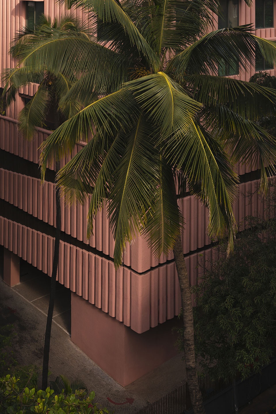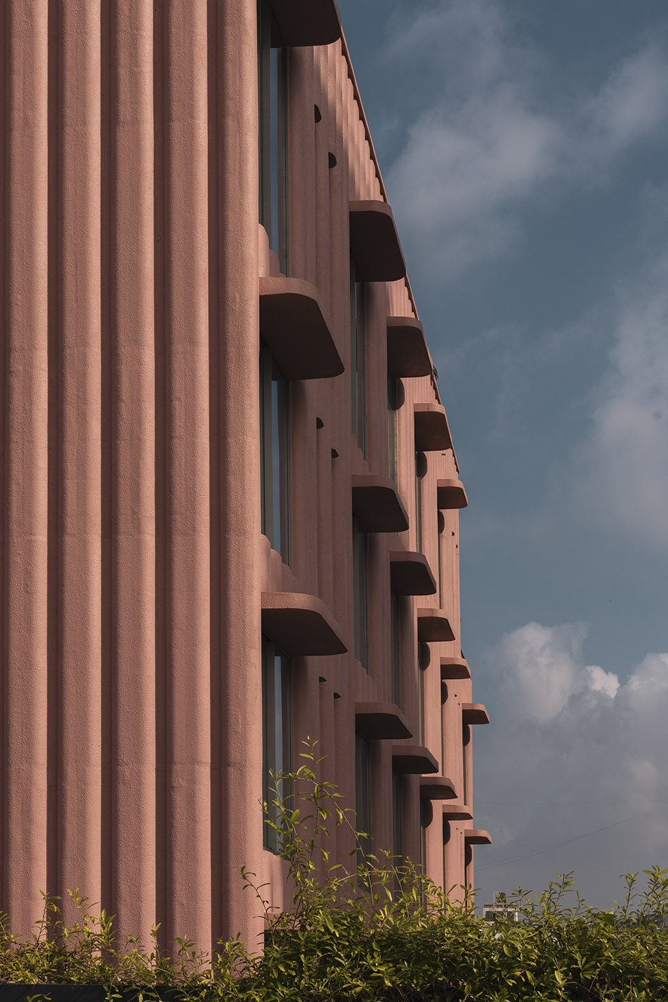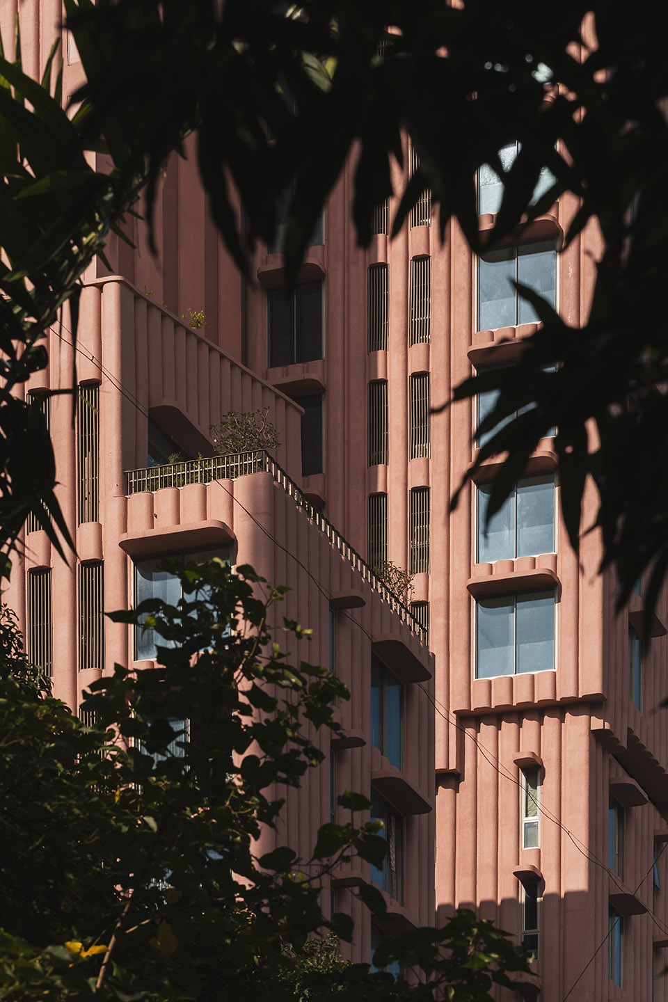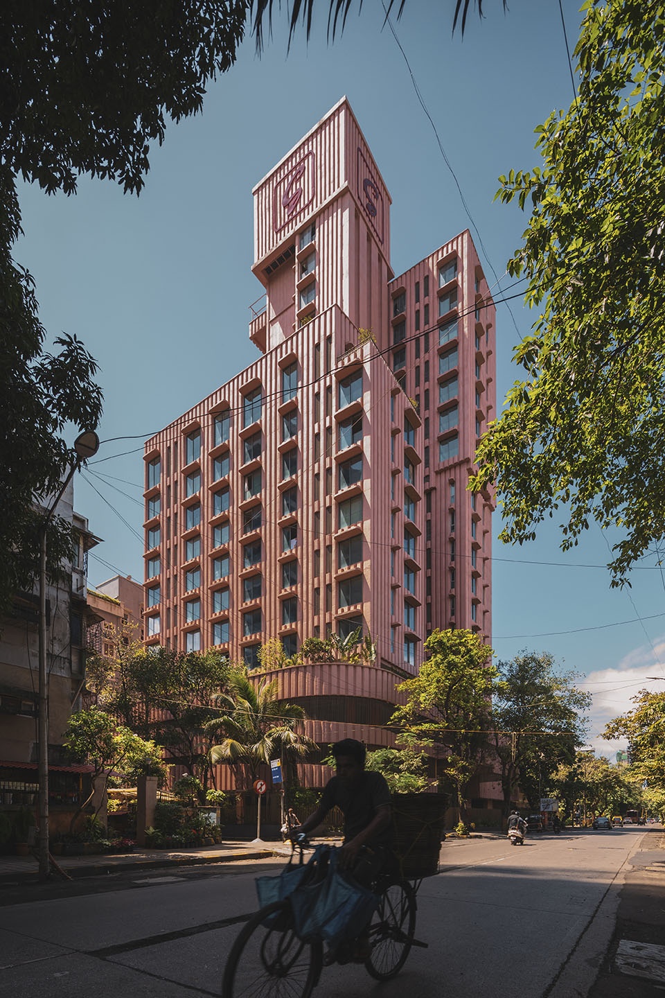 Drawing inspiration from India’s national flower, the lotus, the concrete facade is rendered in a characteristic pink hue, serving as a cultural and visual gesture. The building’s formal composition is expressed with rich artistic intent. Key elements such as the terraces and overhangs feature soft, sweeping curves to imbue the building with a playful, sculptural quality. The rhythmic articulation of the flutings further amplifies this organic form, contributing to a cohesive architectural language that stands in striking contrast to its neighbours. As light shifts across the surface, the building’s appearance alternates between apparent solidity and a more subtle, lighter expression, maintaining visual interest throughout the day.