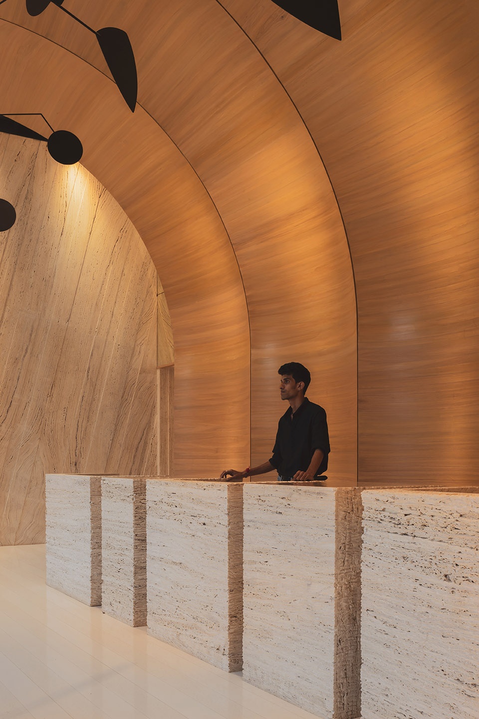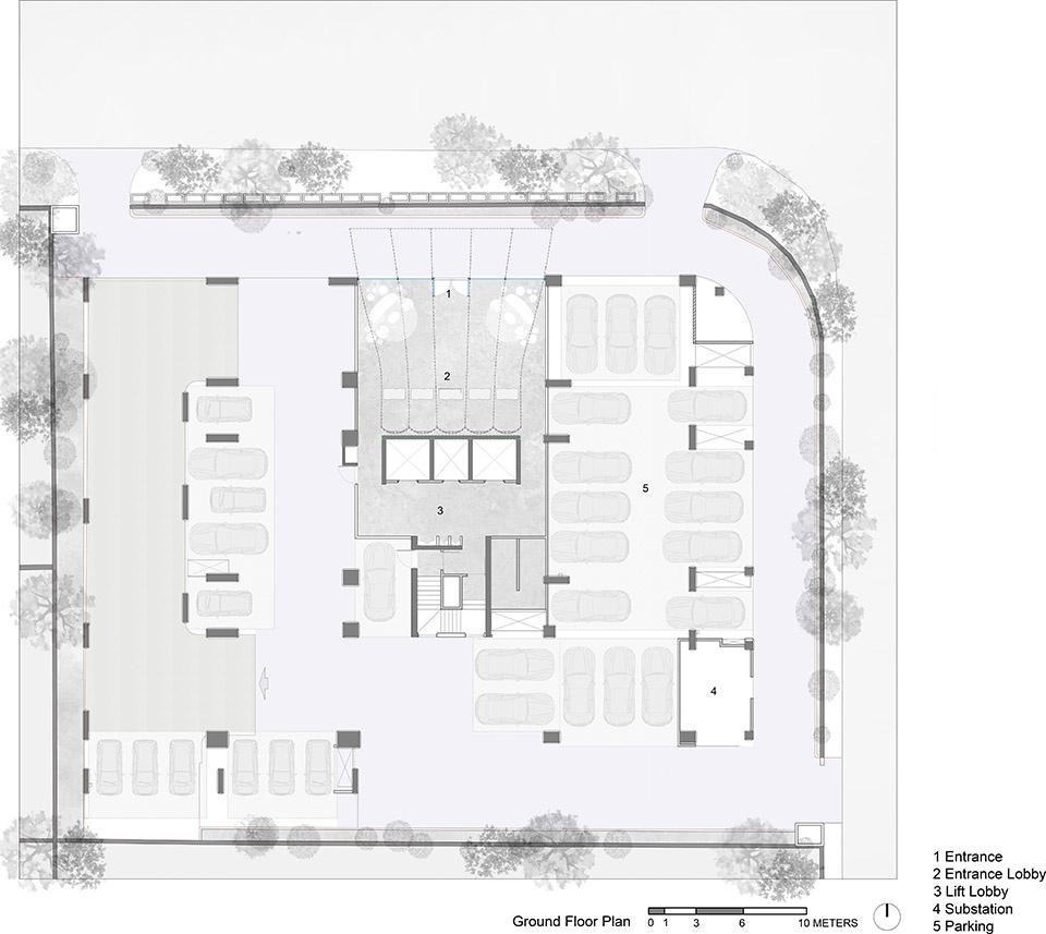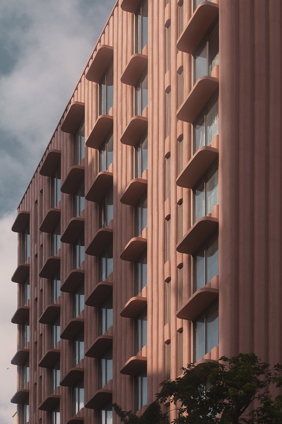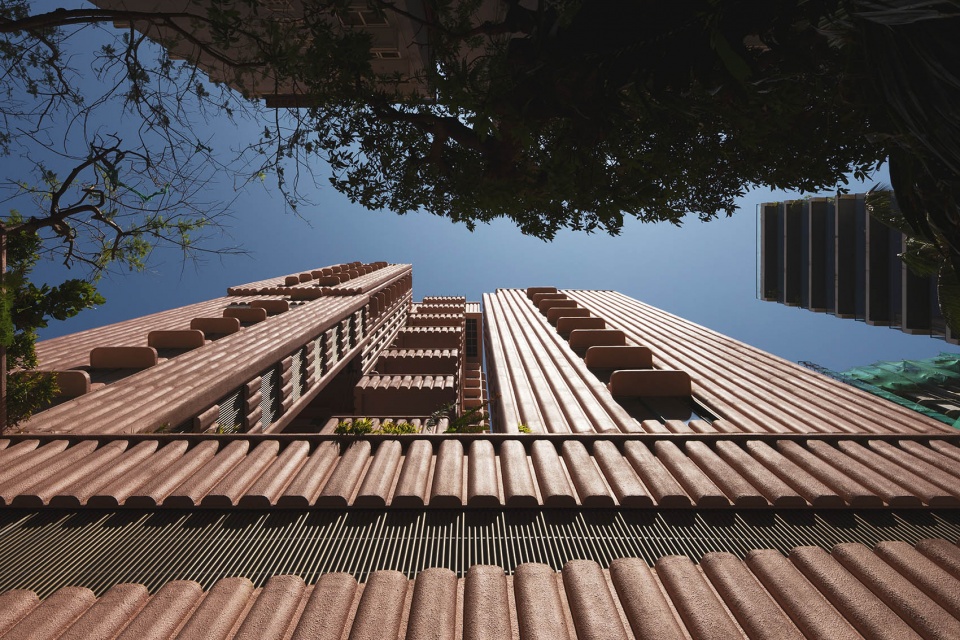Drawing inspiration from India’s national flower, the lotus, the concrete facade is rendered in a characteristic pink hue, serving as a cultural and visual gesture. The building’s formal composition is expressed with rich artistic intent. Key elements such as the terraces and overhangs feature soft, sweeping curves to imbue the building with a playful, sculptural quality. The rhythmic articulation of the flutings further amplifies this organic form, contributing to a cohesive architectural language that stands in striking contrast to its neighbours. As light shifts across the surface, the building’s appearance alternates between apparent solidity and a more subtle, lighter expression, maintaining visual interest throughout the day.