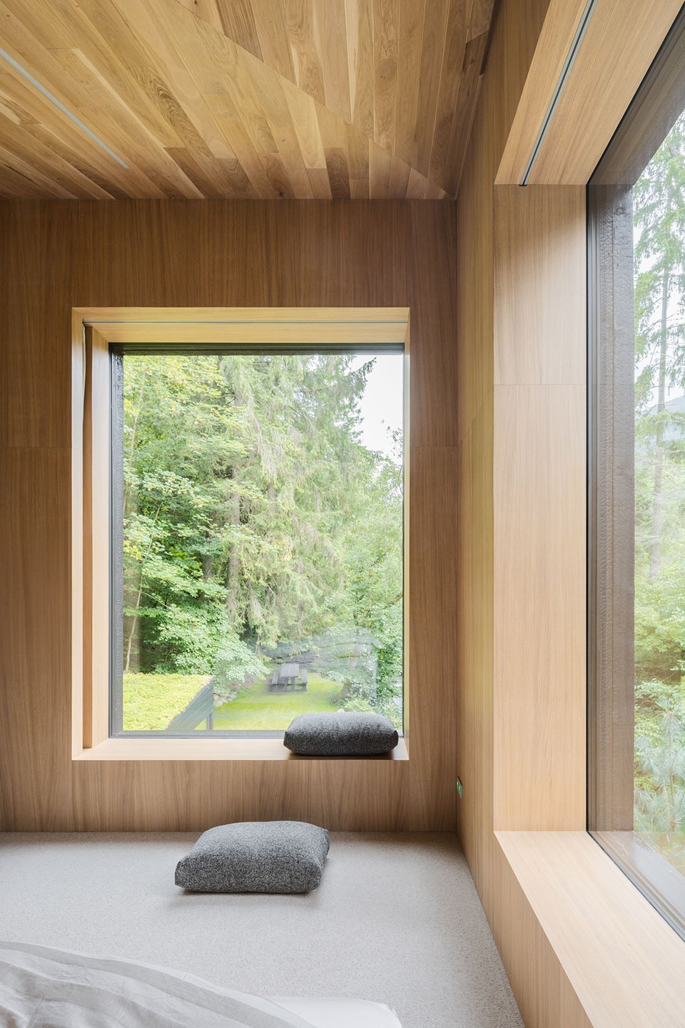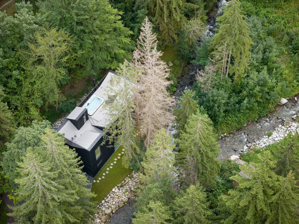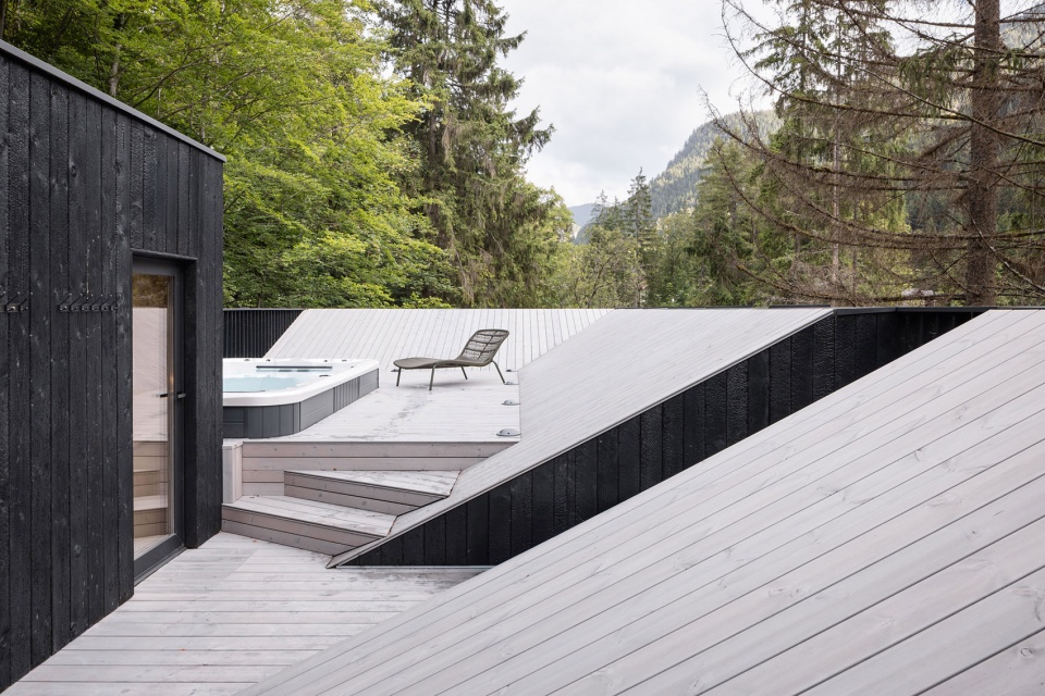 The rooftop terrace with hot tub has been designed in a form of an “inverted landscape.” The sloping roofs of the bedrooms carve out sheltered niches for relaxation, creating a topography that maximizes privacy despite the visual closeness of neighboring cabins, while simultaneously opening infinite upward views of the sky through treetop frames.