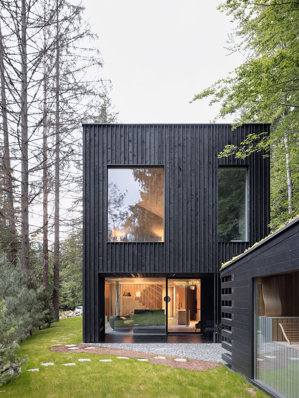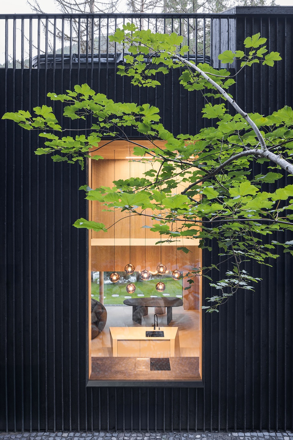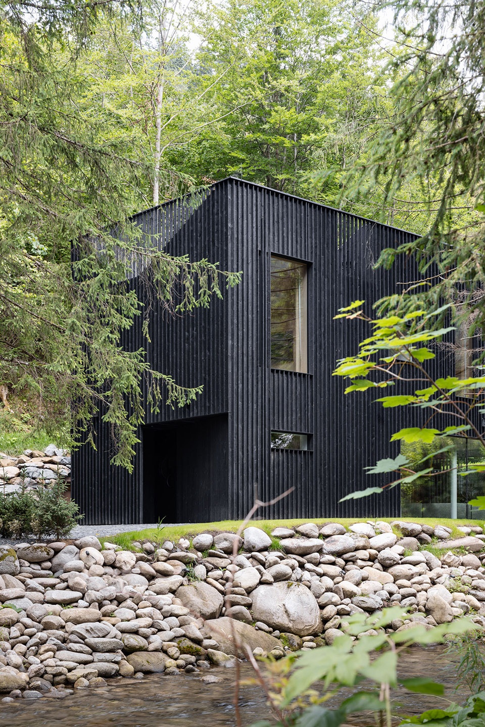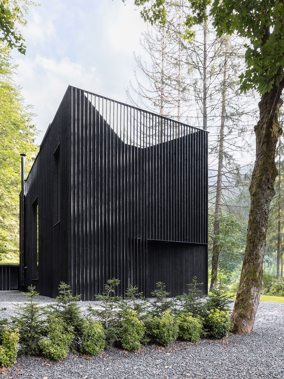 The facades of the residence are clad in timber treated with the traditional Japanese technique of Yakisugi. Controlled charring enhances durability against weathering and biological agents, increases fire resistance, and, with its deep matte black surface, lends the building a bold and unmistakable character.