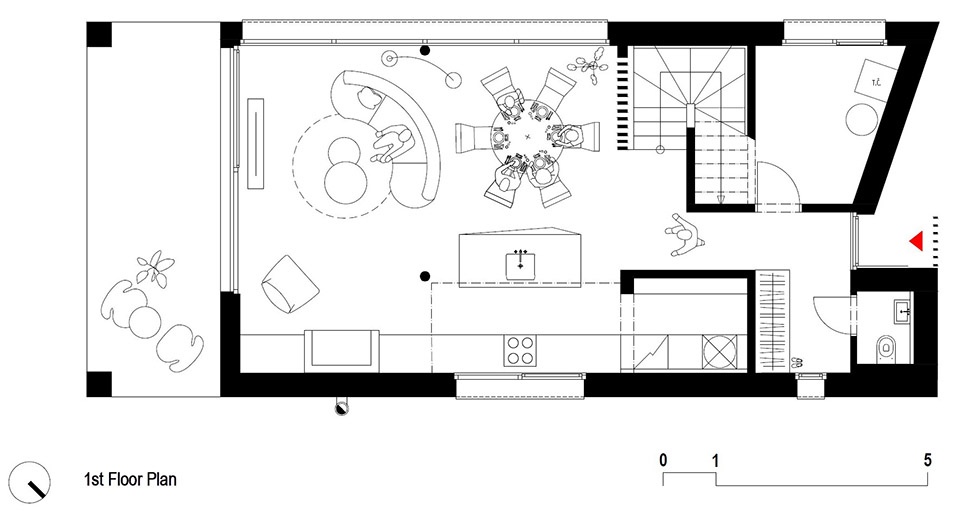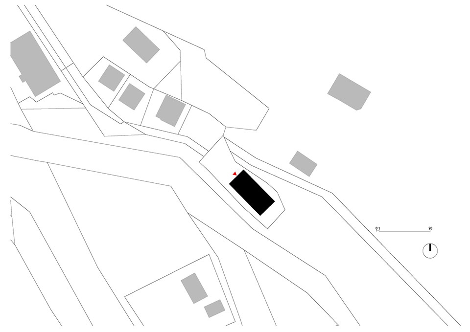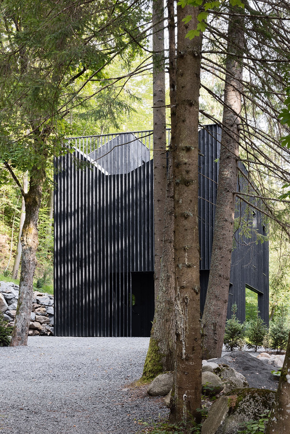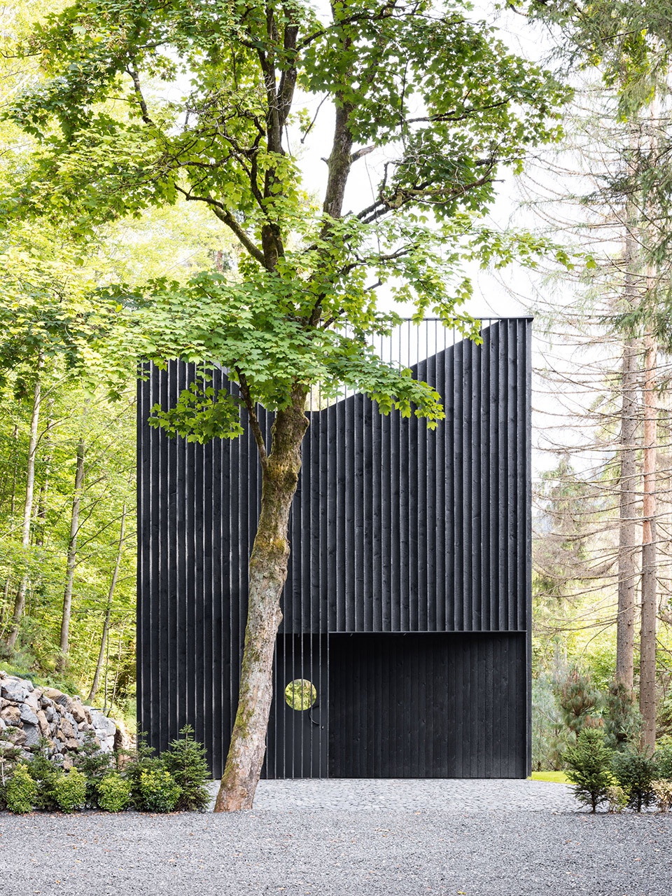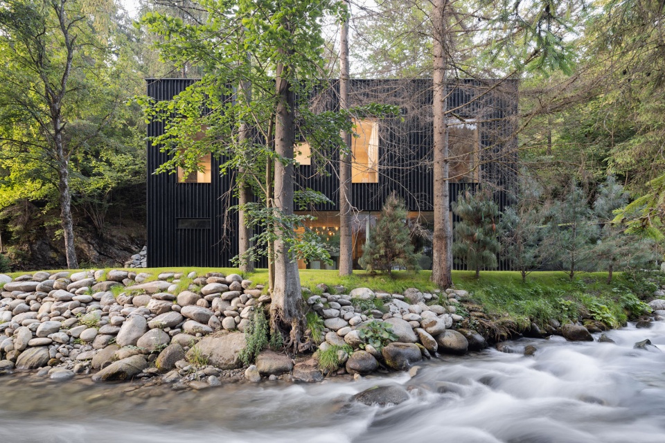 The facades of the residence are clad in timber treated with the traditional Japanese technique of Yakisugi. Controlled charring enhances durability against weathering and biological agents, increases fire resistance, and, with its deep matte black surface, lends the building a bold and unmistakable character.