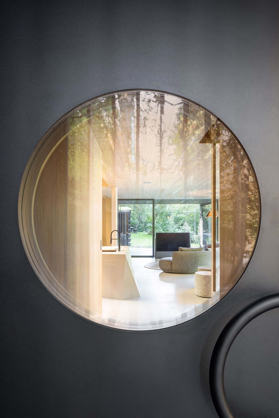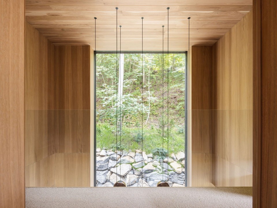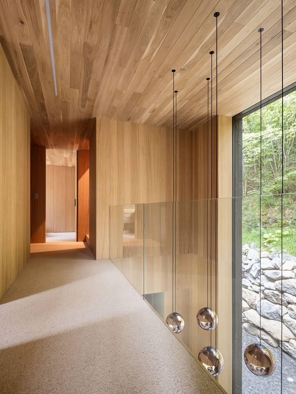 The spatial composition of the house comes directly from its setting, shaped by the rhythm of the stream and the tall trees that envelop it. These natural features became the primary design determinants. The building’s volume, conceived as a prism discreetly set among the trees, runs parallel to the watercourse, ensuring the stream remains the central, ever-changing presence in the main living space—captured through vast frameless glazing. The same dialogue with water continues upstairs, where all three bedrooms with en- suite bathrooms frame face the views and sounds of the flowing stream.