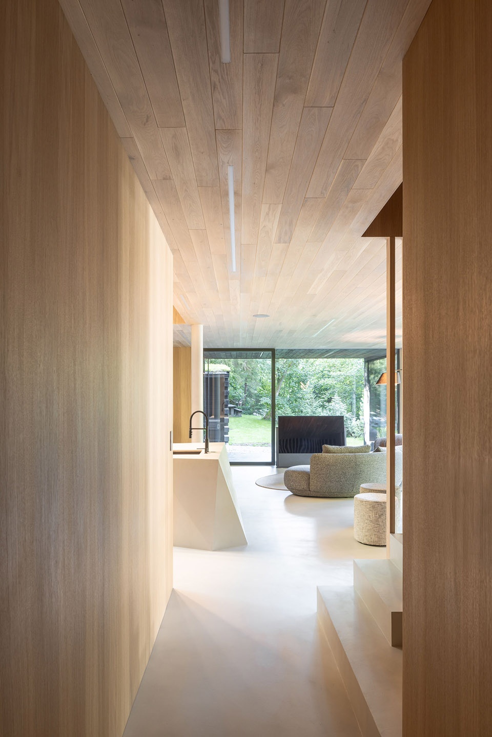 Inside, the atmosphere is defined by warm timber veneers wrapping walls and ceilings, contrasted with microcement floors in the living areas and bathrooms. A restrained palette of furnishings emphasizes mood over excess, ensuring that comfort arises not from abundance, but from clarity, harmony, and calm.