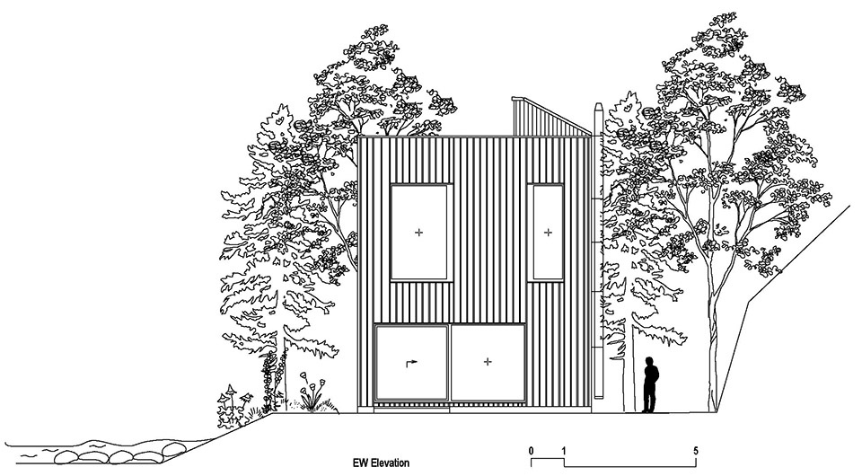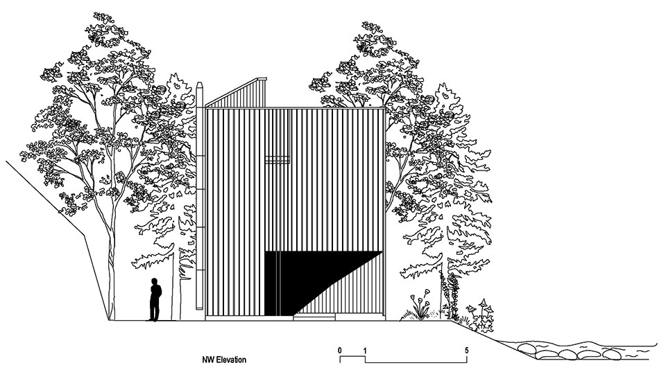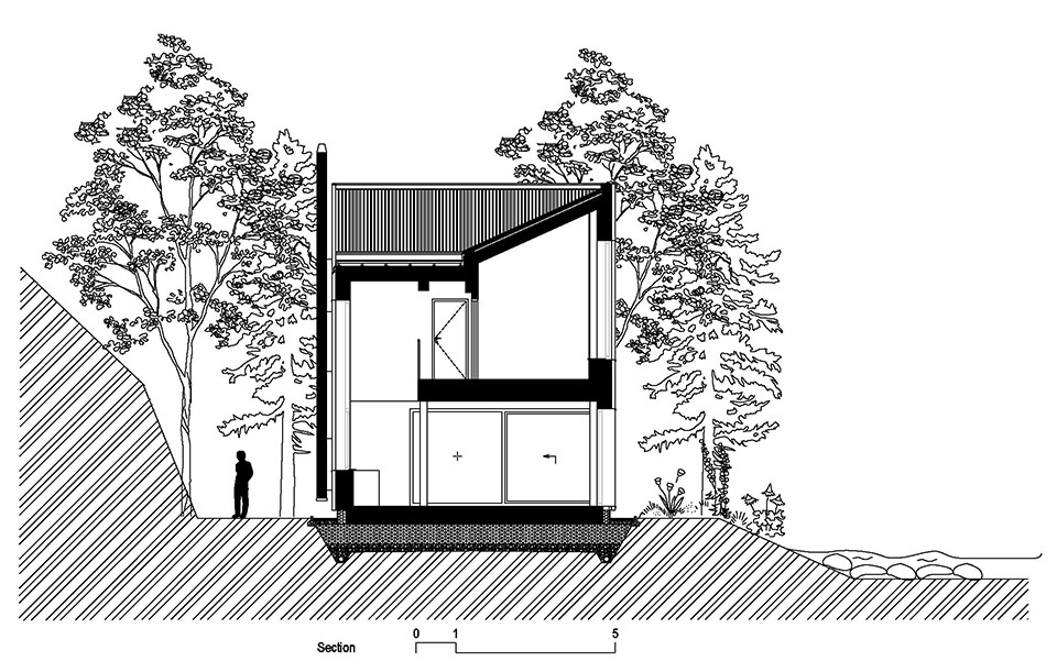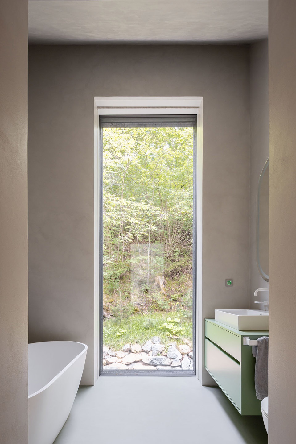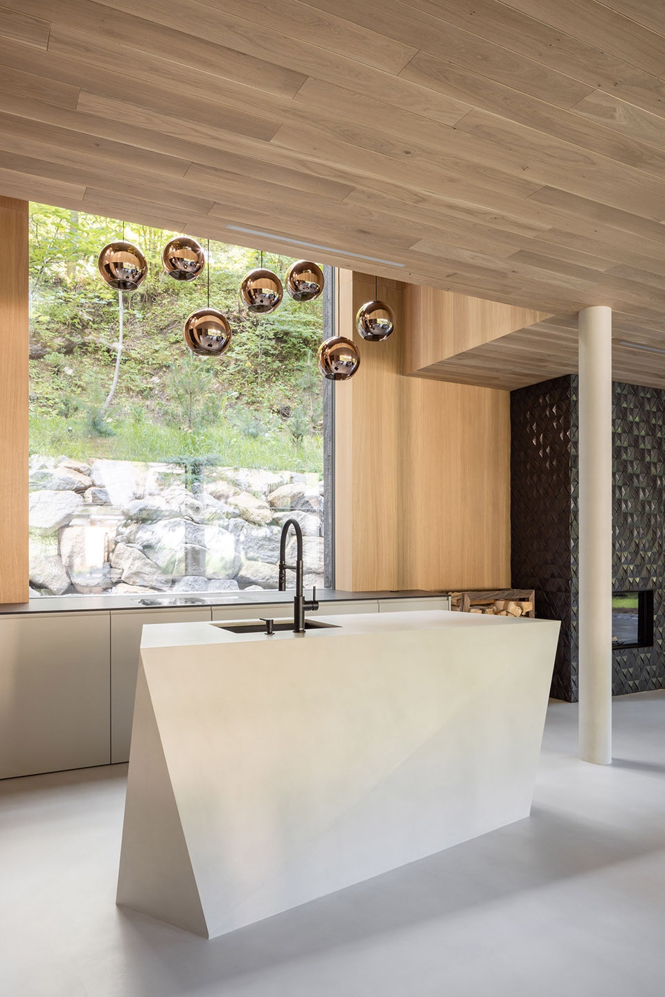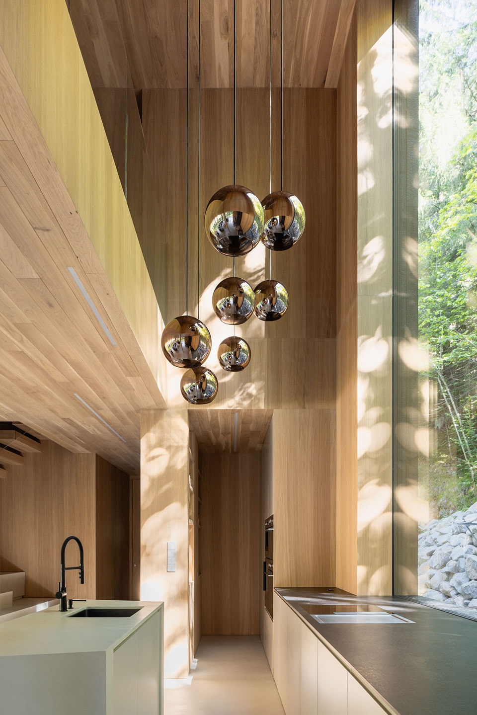 房屋的空间布局直接来源于其所在环境,受到溪流节奏和高大树木的影响。这些自然元素成为了设计的主要决定因素。建筑的体量被设想为一个隐蔽地融入树木中的棱柱,平行于水流延展,确保溪流始终是主生活空间中的核心、不断变化的存在——通过巨大的无框玻璃捕捉这一景象。与水的对话延续到楼上,三间带独立浴室的卧室面向溪流的景观和声音。