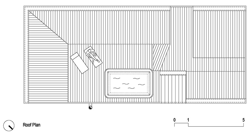屋顶露台配备了热水浴缸,以“倒置的景观”形式设计。卧室的斜屋顶雕刻出休息的隐秘小天地,创造出最大化隐私的地形,尽管邻近小屋的视觉距离很近,但同时通过树梢框架打开了无尽的向上视野。