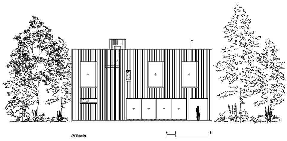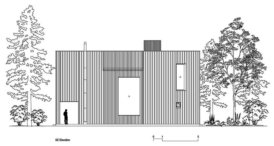 住宅的外立面采用传统日本“烧杉”技术处理的木材包覆。受控的炭化工艺增强了木材的耐候性、抗生物腐蚀性,提高了防火性,并且通过其深沉的哑黑表面,赋予建筑大胆且独特的个性。