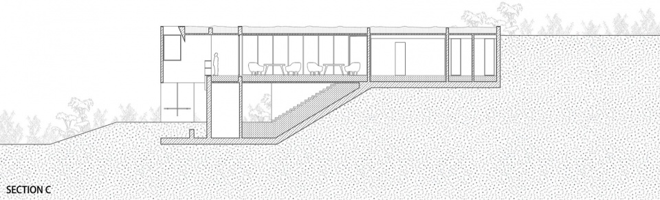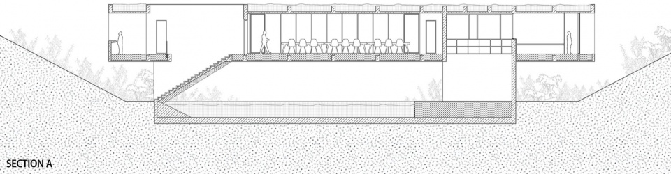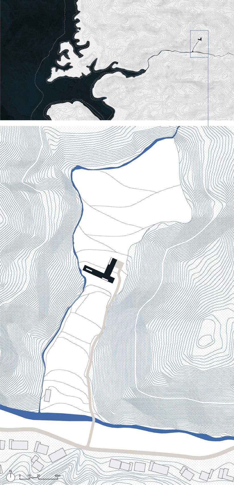 This precise horizontal line—demarcated by the blue metal fence—happened to align perfectly with the edge of the terrace. As it extended laterally across the site, it visually stitched together the hills on either side, unintentionally establishing a landscape threshold that separated upper and lower grounds. Building upon this gesture, we introduced a similarly assertive intervention: a linear architectural insertion into the landform, preserving the distant abstraction while transforming it into a functional landscape corridor.
