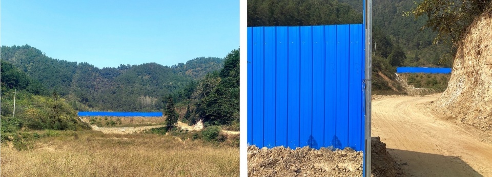 不过,我们意外地被施工方搭建的临时围挡触发了灵感,联想到大地艺术家Christo 与Jeanne-Claude所创作的巨大的、震撼人心的瞬时地景介入装置。远观,这道蓝色围挡以一道纯色横切山谷,仿若数码图像中的涂抹笔触;近看,彩涂金属板的波纹、螺钉与人工痕迹将抽象的形态拉回到现实的自然中。不同于艺术家作品中以轻盈布料顺势与山体对话,这道金属直线并不顺应地形,而是冷硬地划定施工场域。由于台地由削坡而成,这条工业蓝线反而强化了人工切口,将两侧山体并置,生成一种带荒诞幽默的“人工山谷”。